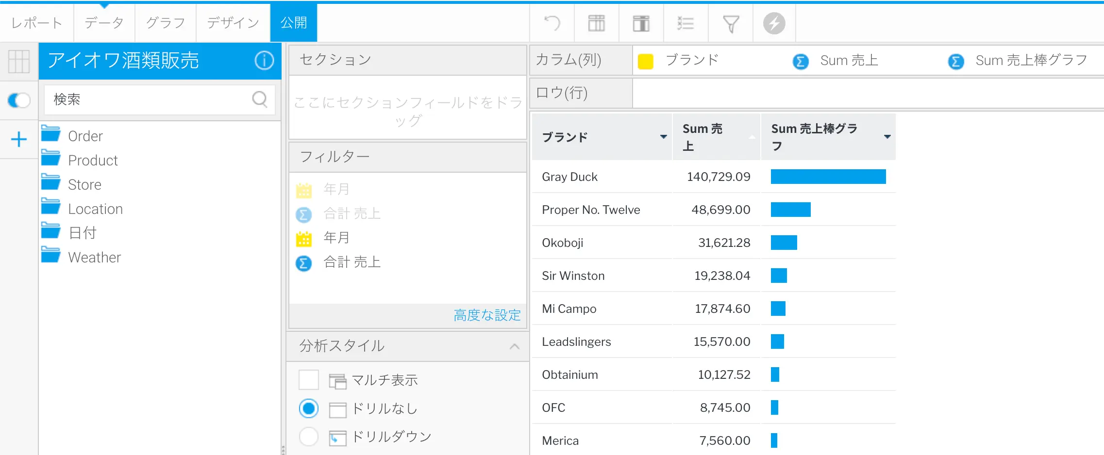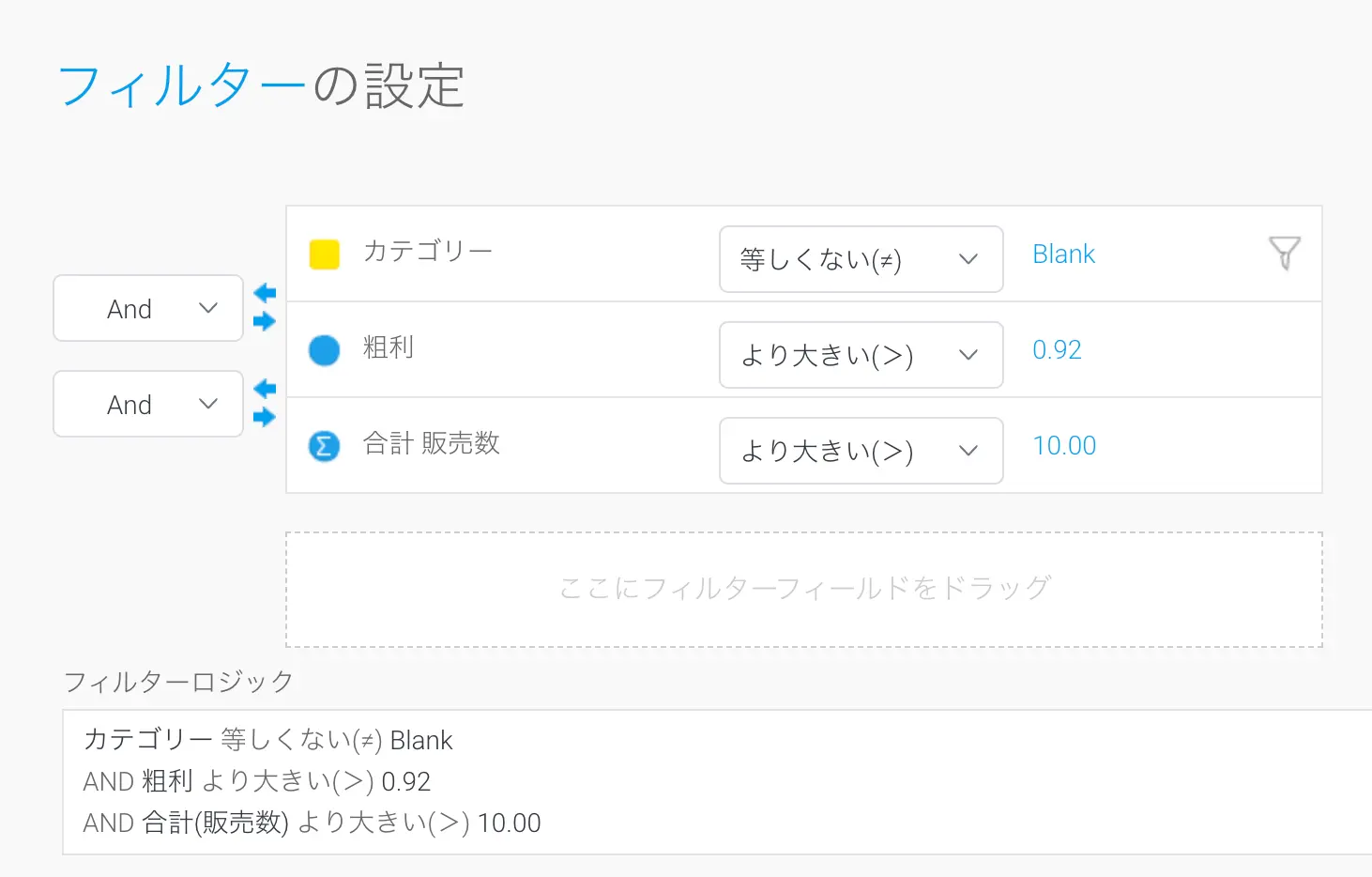 例えば、商品の注文を含むデータがある場合、販売数>10 というフィルターを適用すると、個々の注文レベルで適用され、条件はWHERE句に追加されます。同じフィルターを適用しますが、販売数にSUM集約を追加すると、この条件はHAVING句に移動し、データが集約されグループ化された後にフィルタリングされます。したがって、商品名でグループ化した場合、次に示すように、販売数の合計が10を超えるすべての商品を取得することになります。