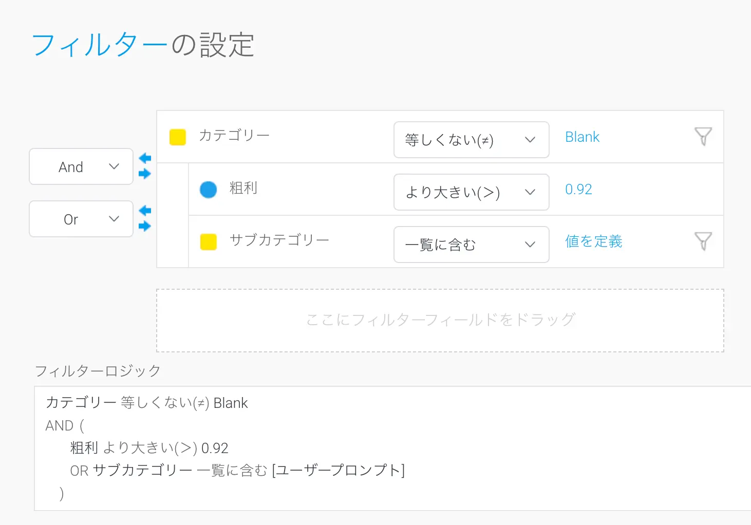 レポートビルダーには高度なフィルター機能があり、DBMSでサポートされているあらゆるタイプのWHERE句を生成することができます。フィルターは、フィルター項目にフィールドをドラッグして定義します。演算子を定義する必要があり、これは数値フィールドや日付に適用できる等しい (=)、等しくない (≠)、より大きい (>)、より小さい (<)、の間 (〜)、IS NULL、IS NOT NULLなどの論理演算子や、一覧に含む、一覧に含まないなどのカテゴリー値演算子から選択します。