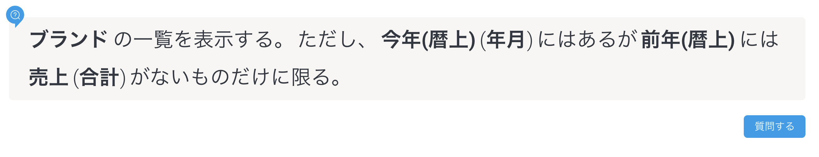 NLQは経験の浅いユーザーを対象としていますが、経験豊富なレポート作成者が複雑なレポートの作成を開始する迅速な方法として使用することもできます。例えば、昨年ではなく今年の売上があるブランドを見つけるために高度なサブクエリーを手作業で作成するのではなく、次のようにガイド付きNLQに入力することができます。