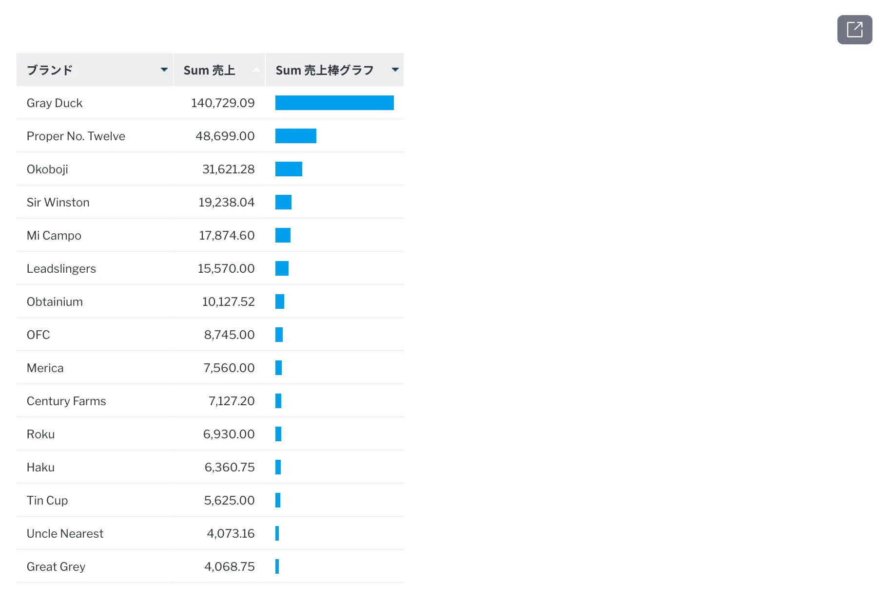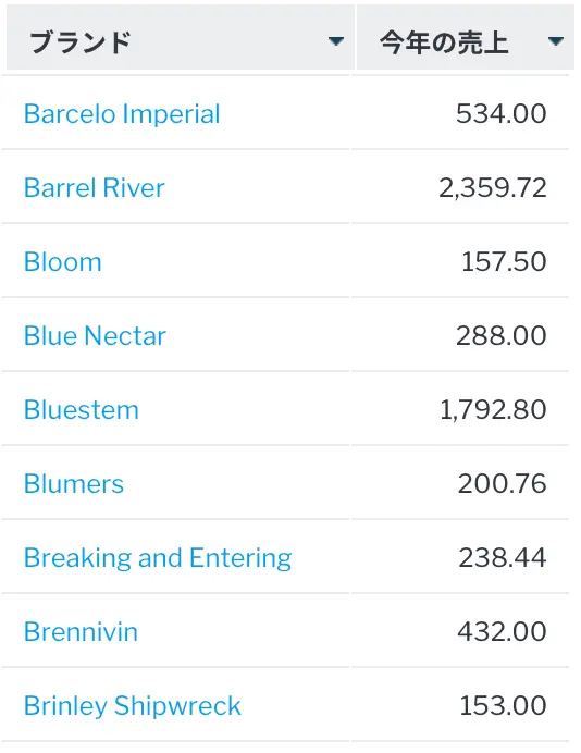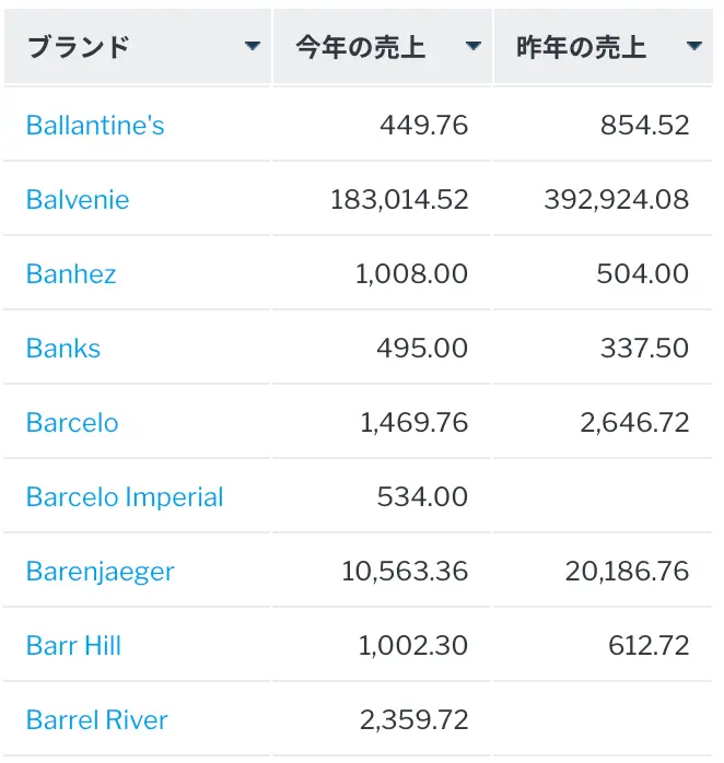 または、より複雑な例として、昨年は売り上げがなかったが、今年はは売上があったブランドについてレポートすることもできます。これは、マイナスサブクエリーを使用することで実現できます。