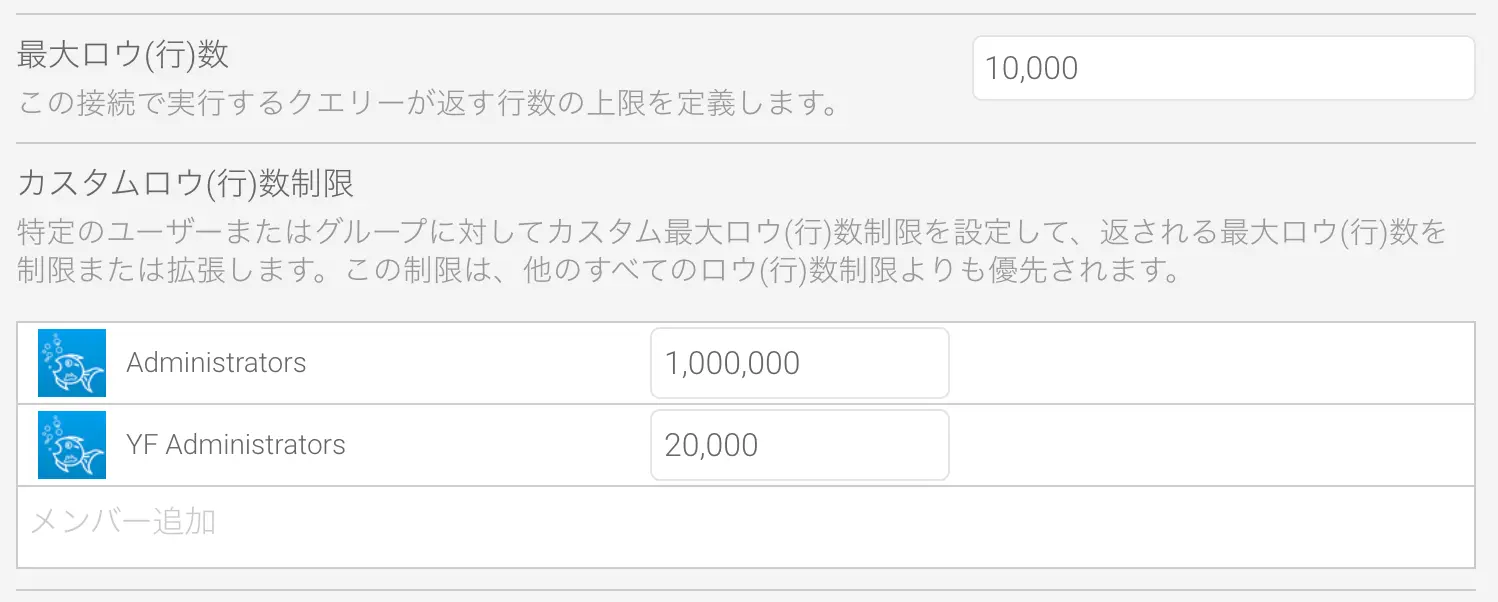データベースが非常に大きい場合、ユーザーが非常に時間のかかるクエリーを作成する可能性があり、SaaS DBMSの場合にはコストが高くなることになります。Yellowfinは、大規模なクエリーの実行からシステムを保護するために複数のセーフガードを備えています。ロウ (行) 数制限はデータソースレベルで構成でき、個々に変更することができます。そのため、経験豊富なユーザーは行数制限を大きくし、経験の浅いユーザーには厳しく制限することができます。