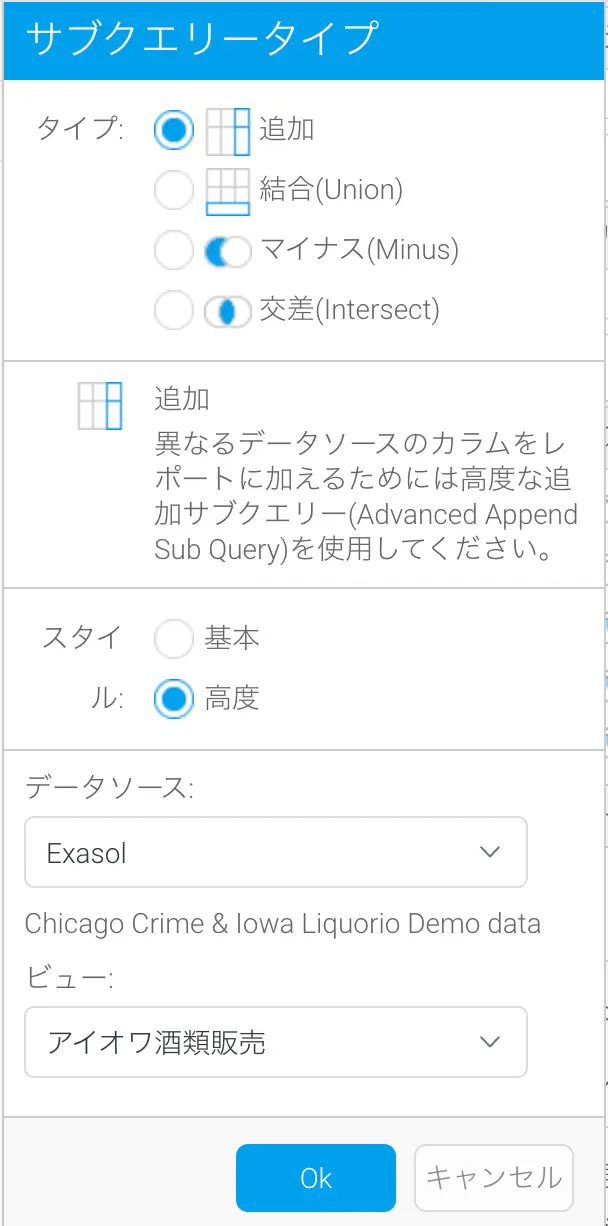 各サブクエリータイプは、同じビューからデータを取得する基本サブクエリーか、高度なサブクエリーのいずれかになります。高度なサブクエリーでは、親クエリーとは異なるビューからデータを取得することができます。このビューは、全く別のデータソースからデータを取得することができます。つまり、セールスデータと人事データを、異なるデータベースの営業担当者に関するデータと組み合わせることができます。