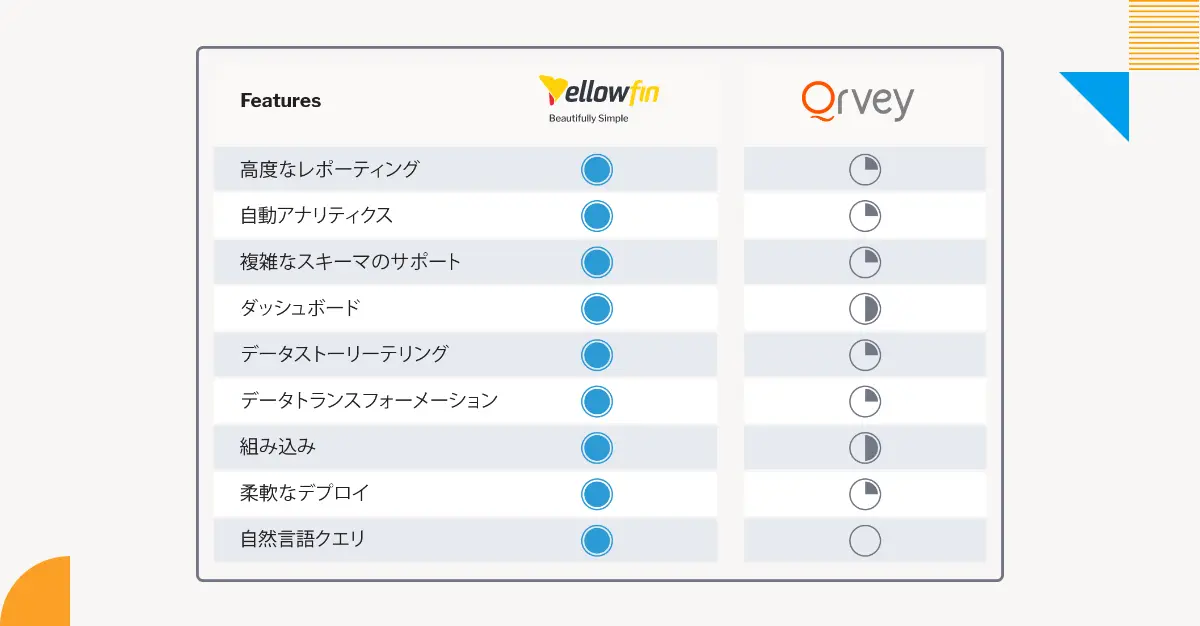 機能や特徴におけるYellowfinとQrveyの比較概要