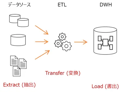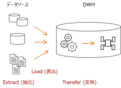ETLはデータをExtract(抽出)、Transformation(変換)、Load(書き出し)することを意味します。業務システムなどのデータソースからデータを抽出し、ETLでデータを加工してから、DWHに書き出します。DWHにデータを格納する前に、必要なデータの加工を済ませてしまうのが特徴です。