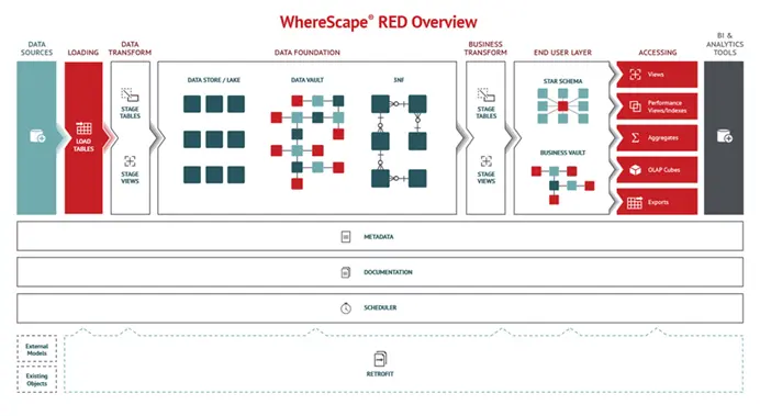 WhereScapeの主な役割はDWHの構築です。そのために、WhereScapeは、3D、RED、Data Vault Express (DVE) の3機能で構成されます。それぞれの役割は大まかに以下の感じです。