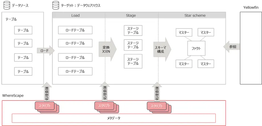データソースから取り込んだデータを未加工のままDWHに取り込み、DWH上でスタースキーマに加工するまでの流れを簡素化したイメージが下記です。イメージ下部WhereScapeは外部データベースのメタデータを管理し、メタデータをもとに生成されたスクリプトで、外部データベースに対してデータのロードや変換などの実行を委譲します。データのロードや変換の実処理は、全て外部データベースのリソースを使って実行するため、パフォーマンスも外部データベースのスペックに依存します。クラウド上のデータベースの処理性能を活用できることから、データ量の多い処理を行う場面で強みを発揮します。いわゆるELTの処理の流れです。