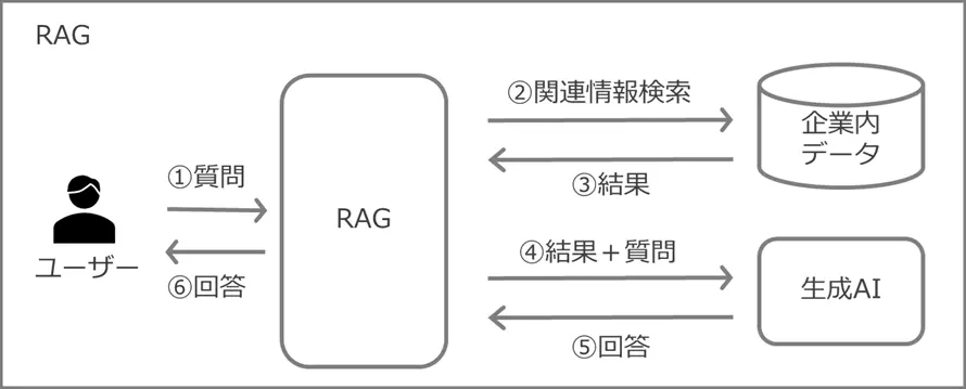 生成 AI が未学習の情報を含む企業内データを検索した結果を伴って、生成 AI に質問を投げかけ、より精度の高い回答を得る仕組みがRAGです。RAGは日本語で検索拡張生成と表現されます。