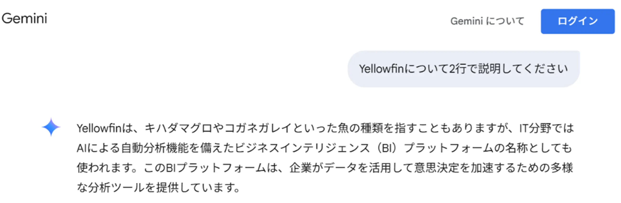 では、Yellowfinについて生成AIに聞いてみましょう。素の状態のGoogle Geminiに問い合わせる場合と、RAGの仕組みを介してGeminiに問い合わせを行う場合とで、回答内容がどのように異なってくるのかを確認してみようと思います。