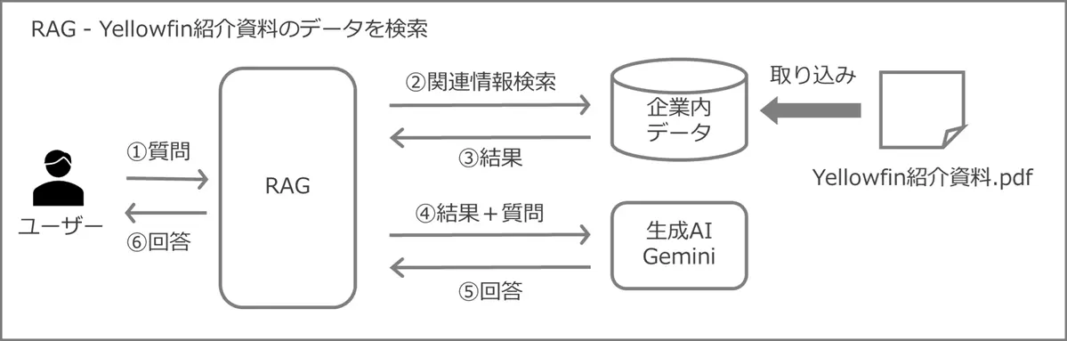 今度はRAGを使ってGeminiに質問します。企業内データを持つデータベースには、Yellowfin Japanが自社製品の紹介に用いる『Yellowfin紹介資料.pdf』に含む情報を登録しました。顧客への初回訪問時に使う目的の資料で、会社や製品の説明に加え、組み込みの分野での強みなどを説明するものです。