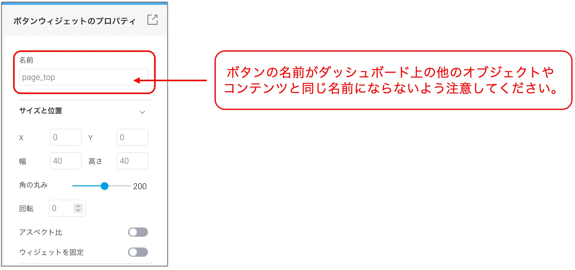 コードモードで使用するために、アクションボタンに名前をつけます。ダッシュボード上の他のオブジェクトと同じ名前にならなければどのような名前をつけても良いのですが、ここでは、便宜的に「page_top」という名前にします。