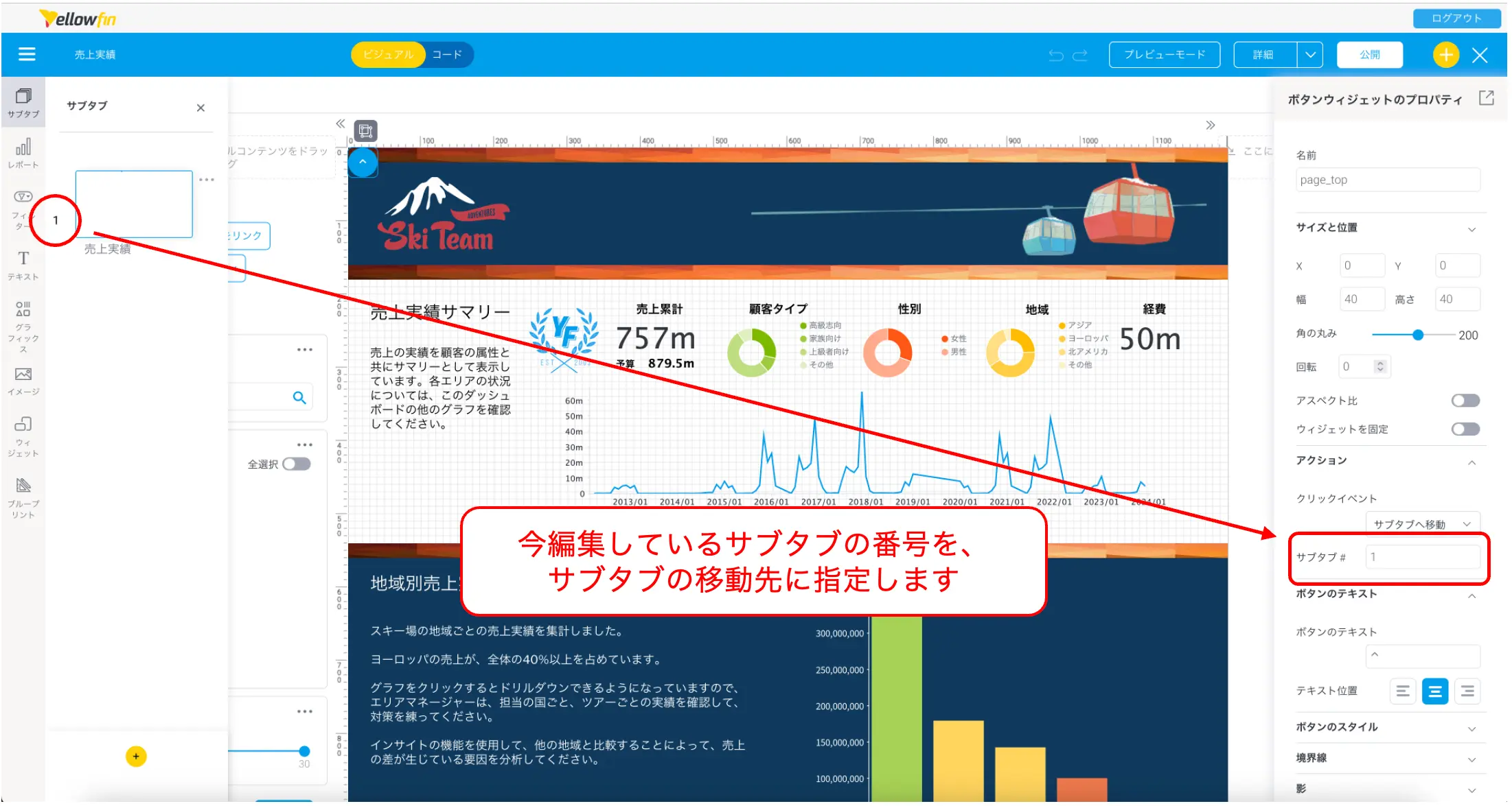 クリックイベントは「サブタブへ移動」に設定し、移動先のタブの番号にそのタブ自身の番号を指定します。現在編集しているサブタブの番号は、レフトサイドメニューの「サブタブ」から確認することができます。