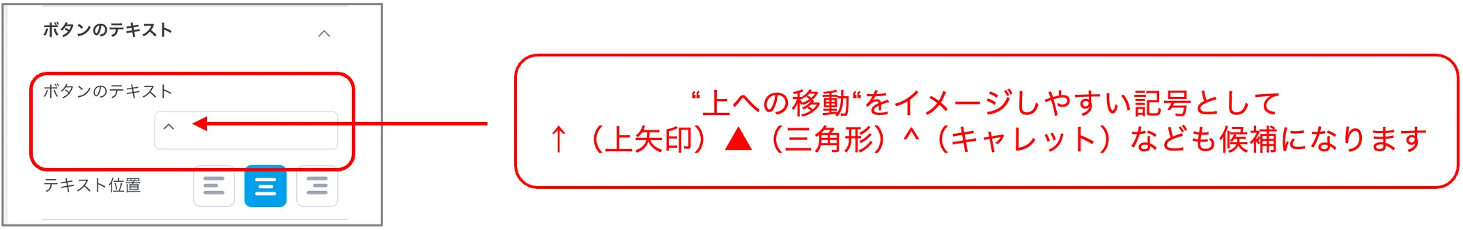 ページのテキストには、トップへ戻るボタンっぽい文字を入力します。今回は「⌃」UP ARROWHEAD(Unicode:U+2303)という文字を使用しています。記号を使用する場合、文字化けしないかどうかを事前に確認しておくと良いでしょう。