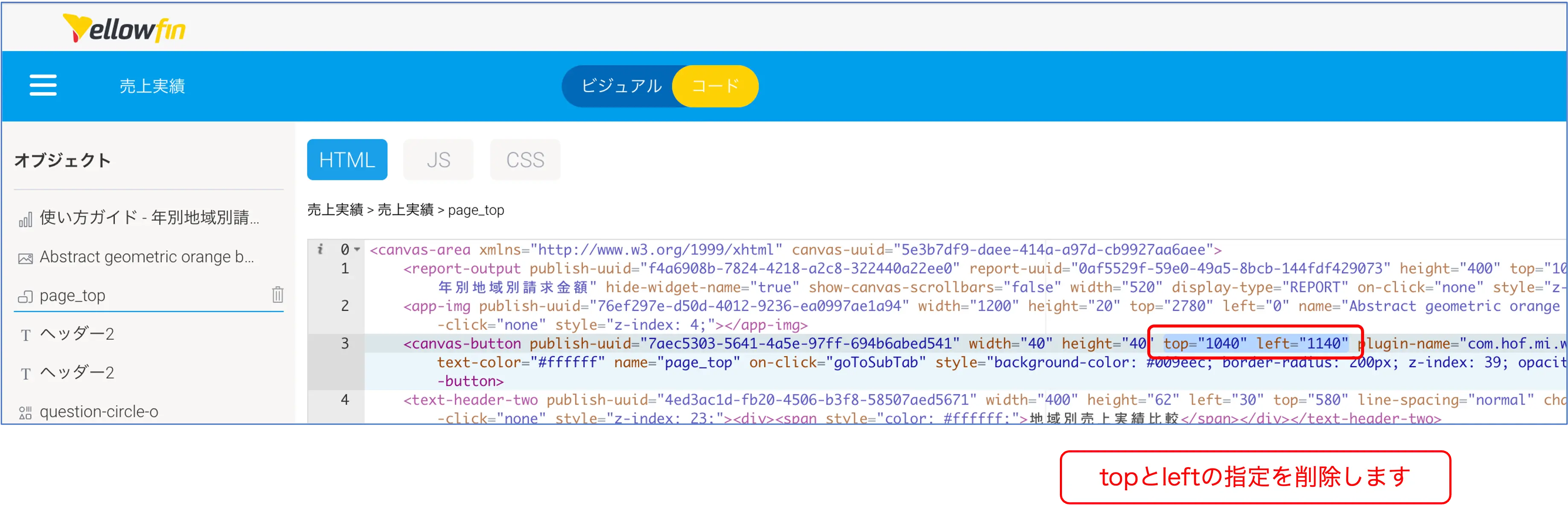 コードモードのHTMLを表示して、オブジェクトの一覧から「page_top」を探してアクションボタンのHTML記述部分を特定します。下の図のようにtop、leftが記述されている箇所がありますので、これを削除します。