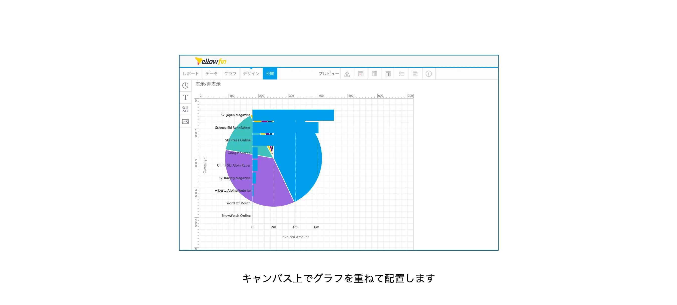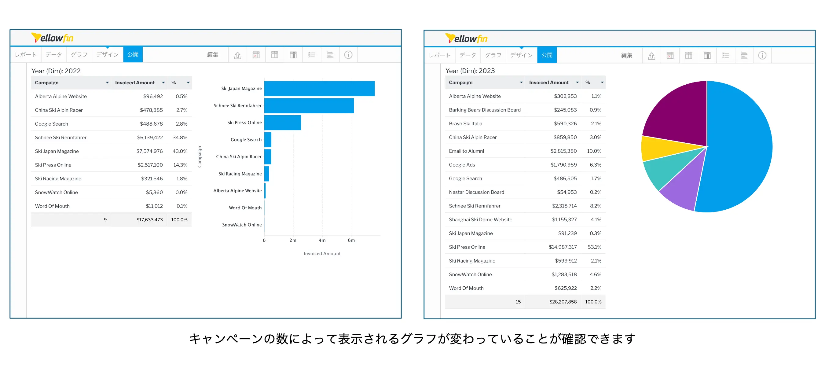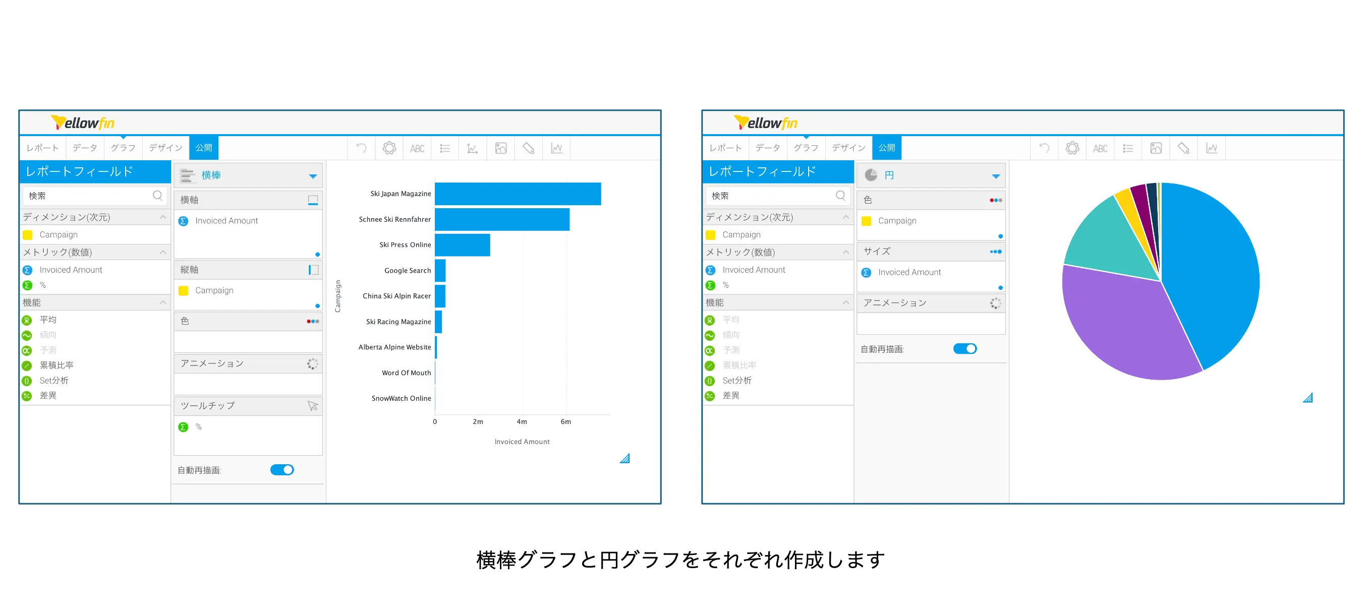 例えば、棒グラフの棒の数が一定数以上になったら円グラフに変更する、というような使い方が考えられます。まず、下の図のように横棒グラフと円グラフを作成します。どちらもキャンペーンごとの売上額と売上構成比率を表現したグラフです。