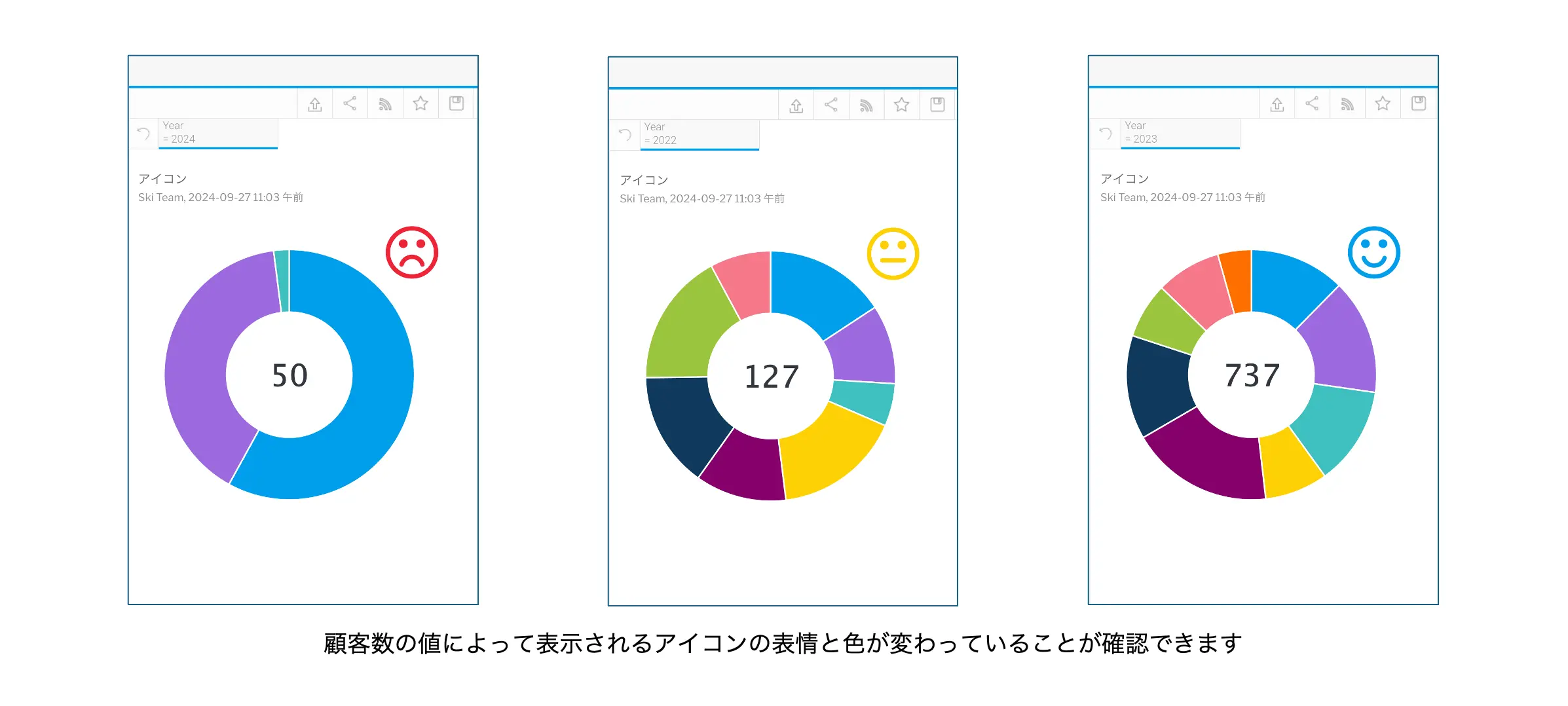 アイコンは、非表示にするだけでなく、アイコンの種類と色も変更することができます。数値の大小に応じてステータスアイコンが変化するような使い方がわかりやすいかと思います。