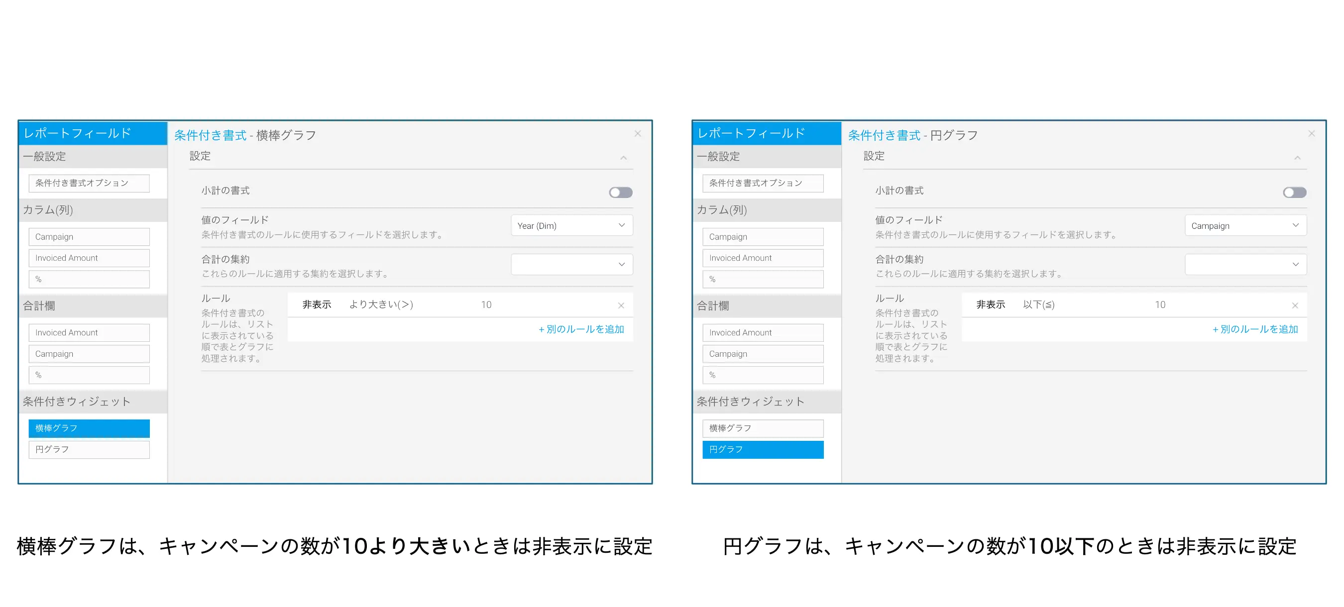 グラフ、テキストウィジェット、線、イメージは、条件付き書式によって、非表示にすることができます。これらのオブジェクトに設定できるのは、非表示にする条件だけですが、複数のオブジェクトの条件を組み合わせることによって、キャンバスに表示するグラフの種類やテキストを変更するというような使い方ができると思います。