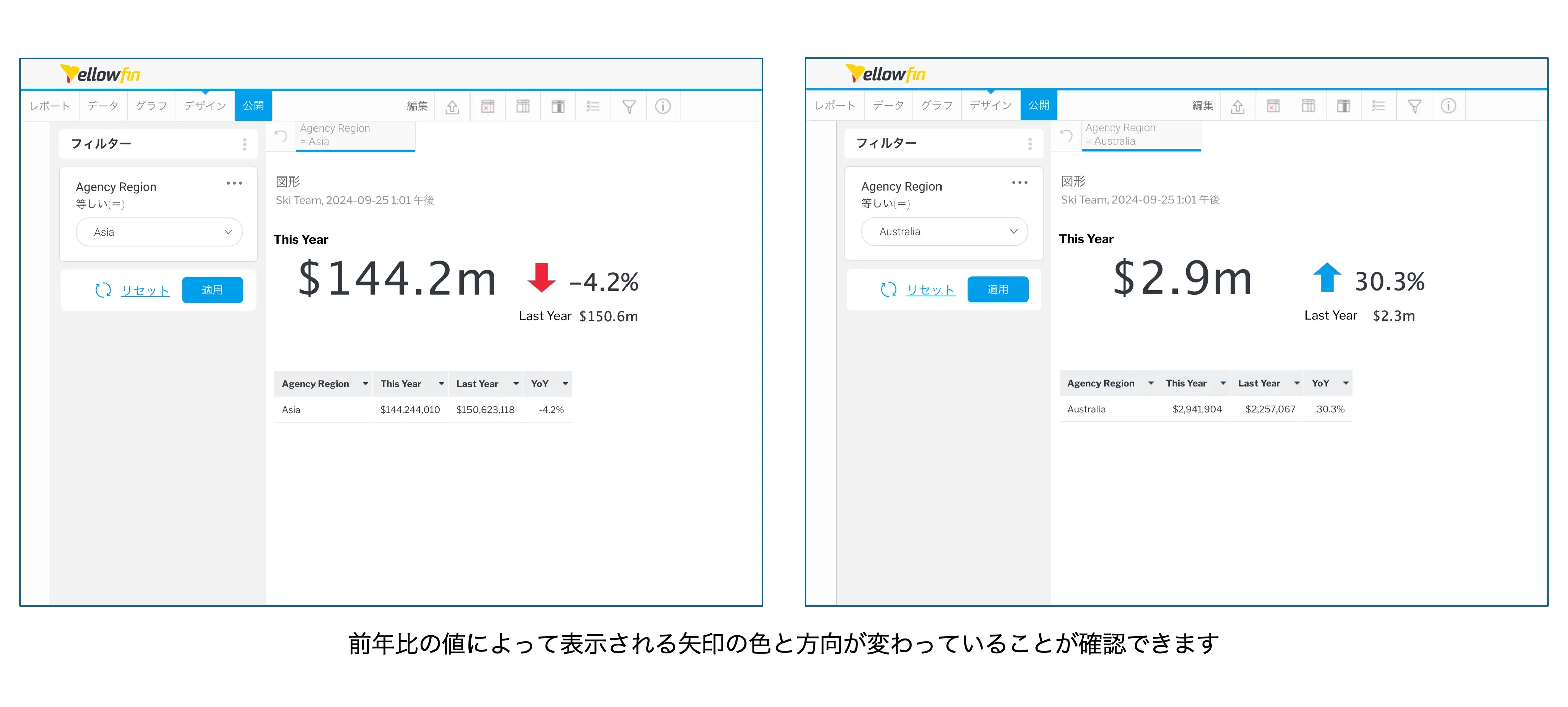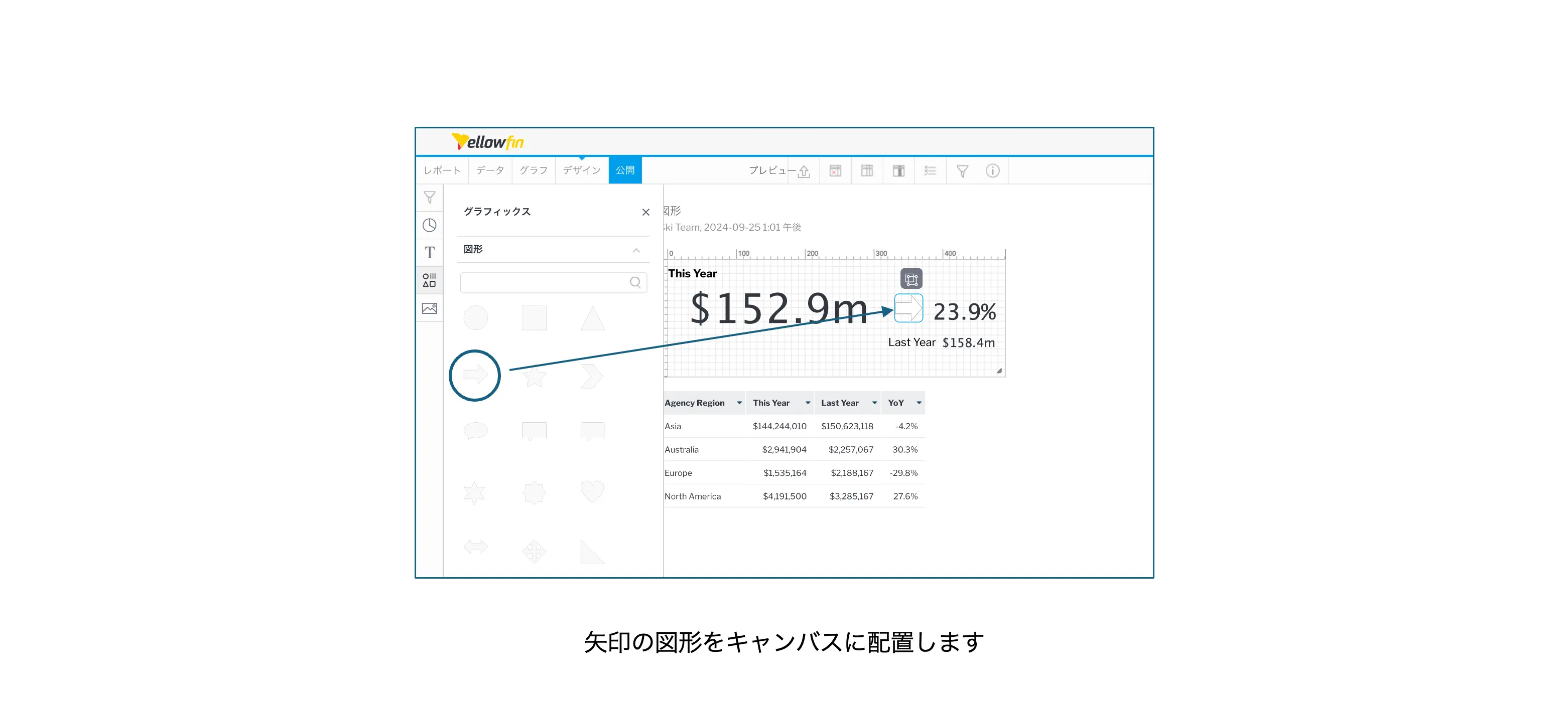例えば、前年比がプラスであれば矢印を上向きに、マイナスであれば矢印を下向きに表示する、というような使い方が考えられます。まず、前年比を表示するレポートを作成し、キャンバスに矢印を配置します。