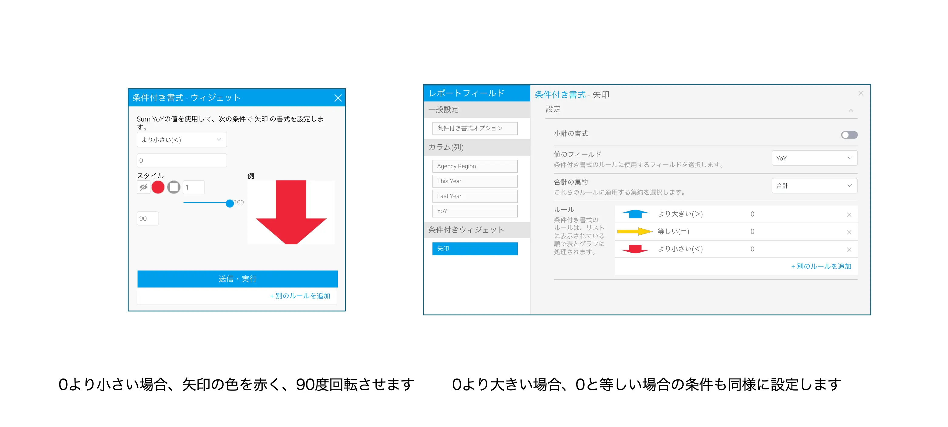 配置した矢印に条件付き書式を設定します。矢印の図形は右向きなので、90度回転させると下向きに、270度回転させると上向きになります。