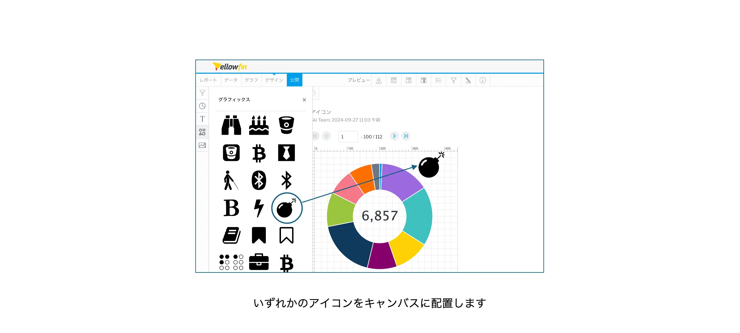 例えば、顧客数に応じて顔のアイコンの表情を変える、というような使い方が考えられます。まず、顧客数を表示するレポートを作成し、キャンバスにアイコンを配置します。今回は、条件付き書式によって表示するアイコンを変化させるので、配置するアイコンの種類は問いません。