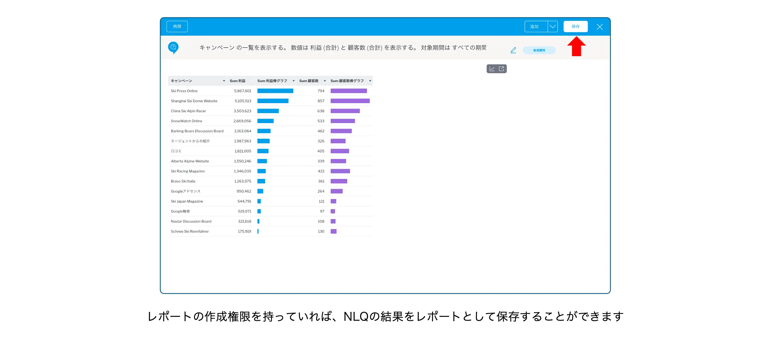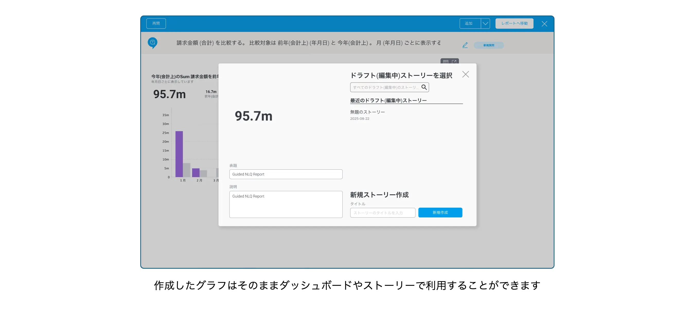 ガイド付きNLQで表示された結果は、グラフの右上のアイコンで表とグラフを切り替えたり、レポートとして開いて編集することもできます。また、右上の「追加」ボタンを使用してダッシュボードやストーリーに直接追加することができます。「保存」ボタンをクリックすると、レポートとして保存することも可能です。
