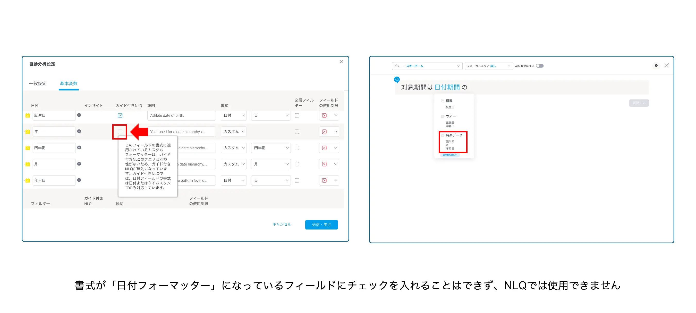 一般設定で「プライマリー日付フィールド」に設定した日付フィールドには、自動でチェックが入ります。日付のフィールドについては、日付フィールドの書式が「日付フォーマッター」になっていると、NLQでは使用することができないので注意してください。NLQで使用したい日付フィールドの書式は、「日付」に設定しておきましょう。