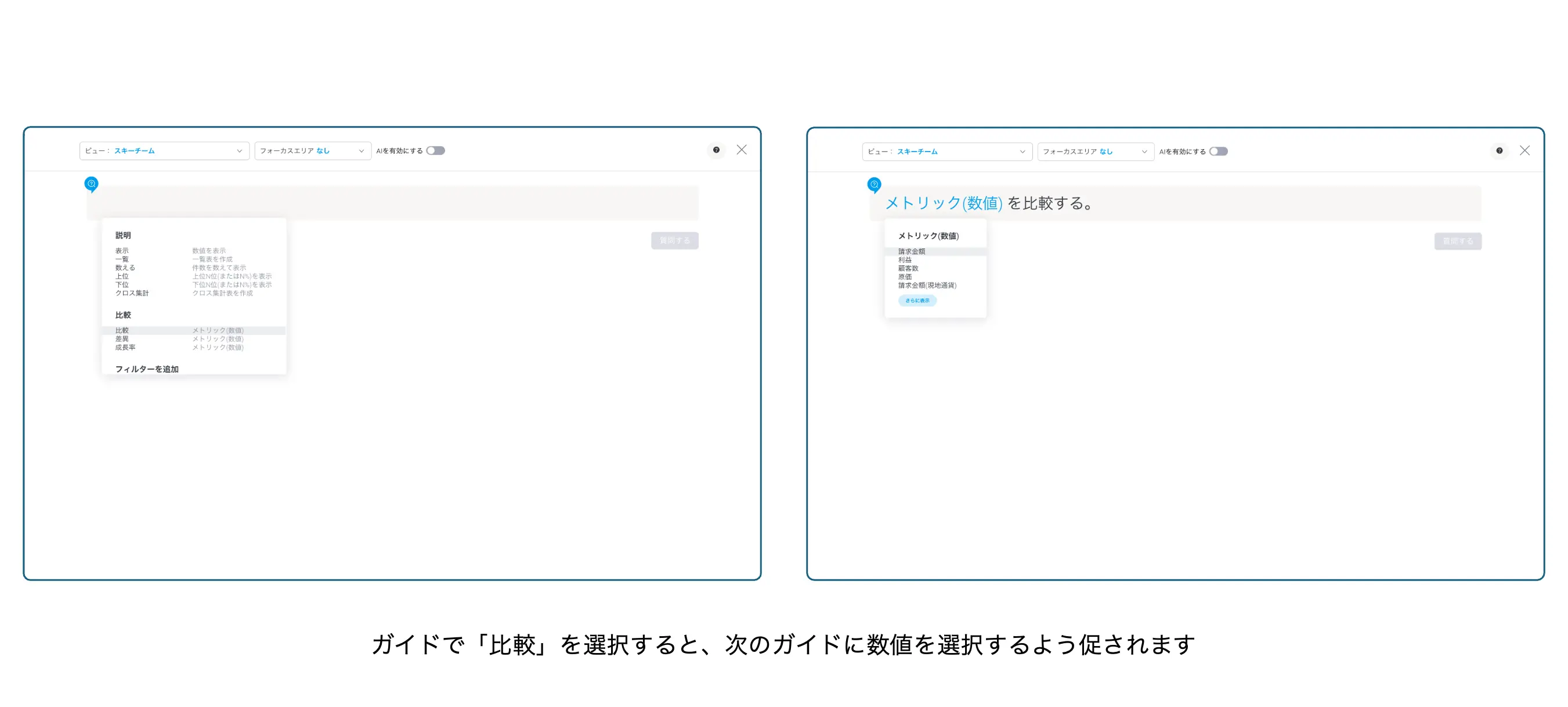 「前年比」を表示する場合は、「比較」を選択します。すると、メトリック(数値)のフィールドを選択するようガイドに促されますので、「請求金額」を選択します。