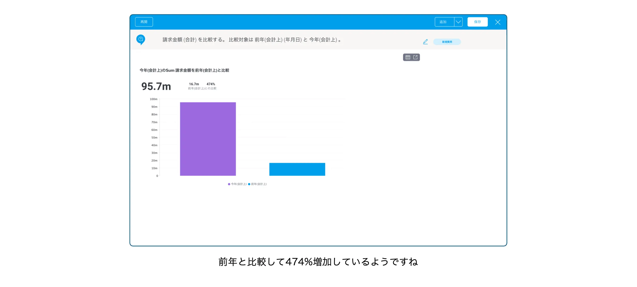 質問文ができあがって「質問する」ボタンをクリックすると前年と今年の請求金額を比較した数値グラフと棒グラフが表示されました。