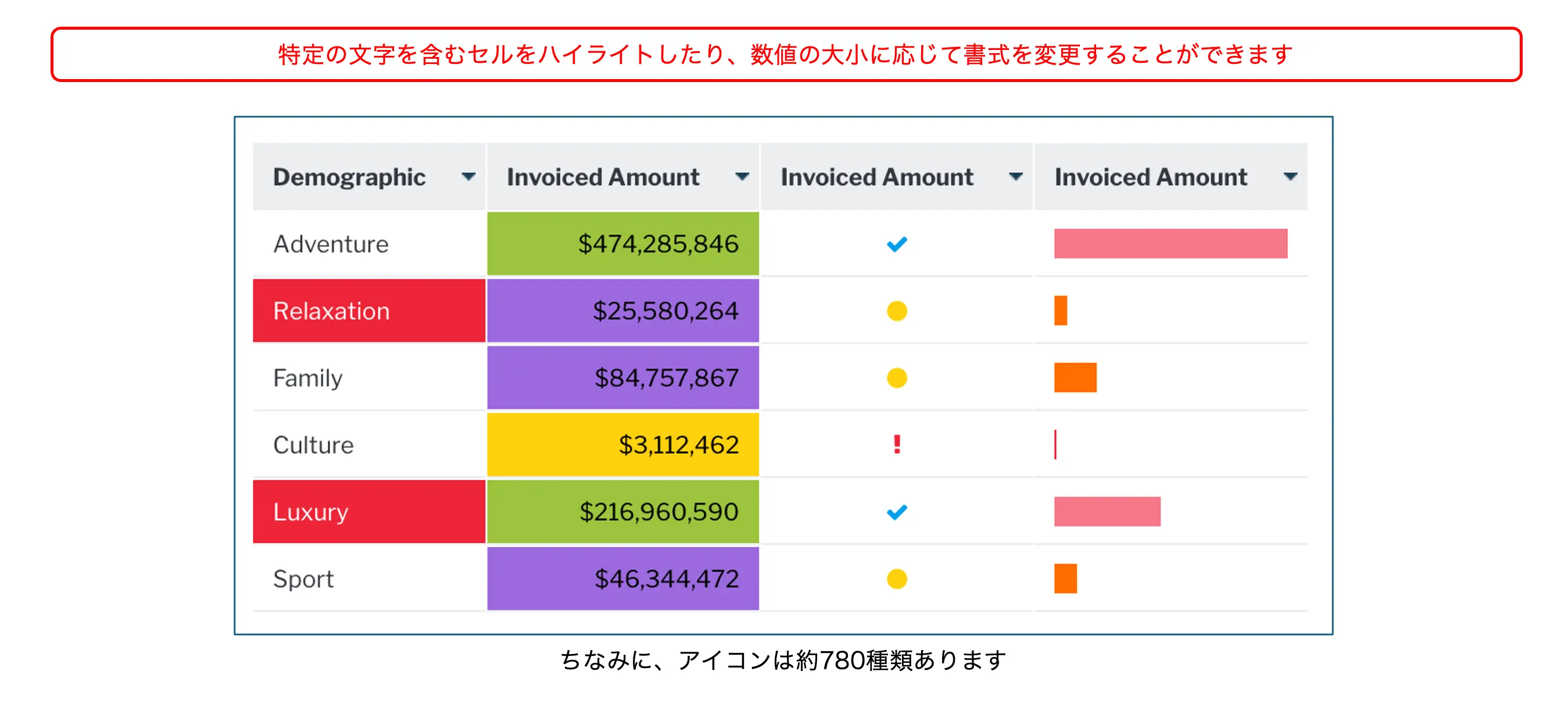 表の条件付き書式では、指定したルールに基づいて以下の3つのことができます。