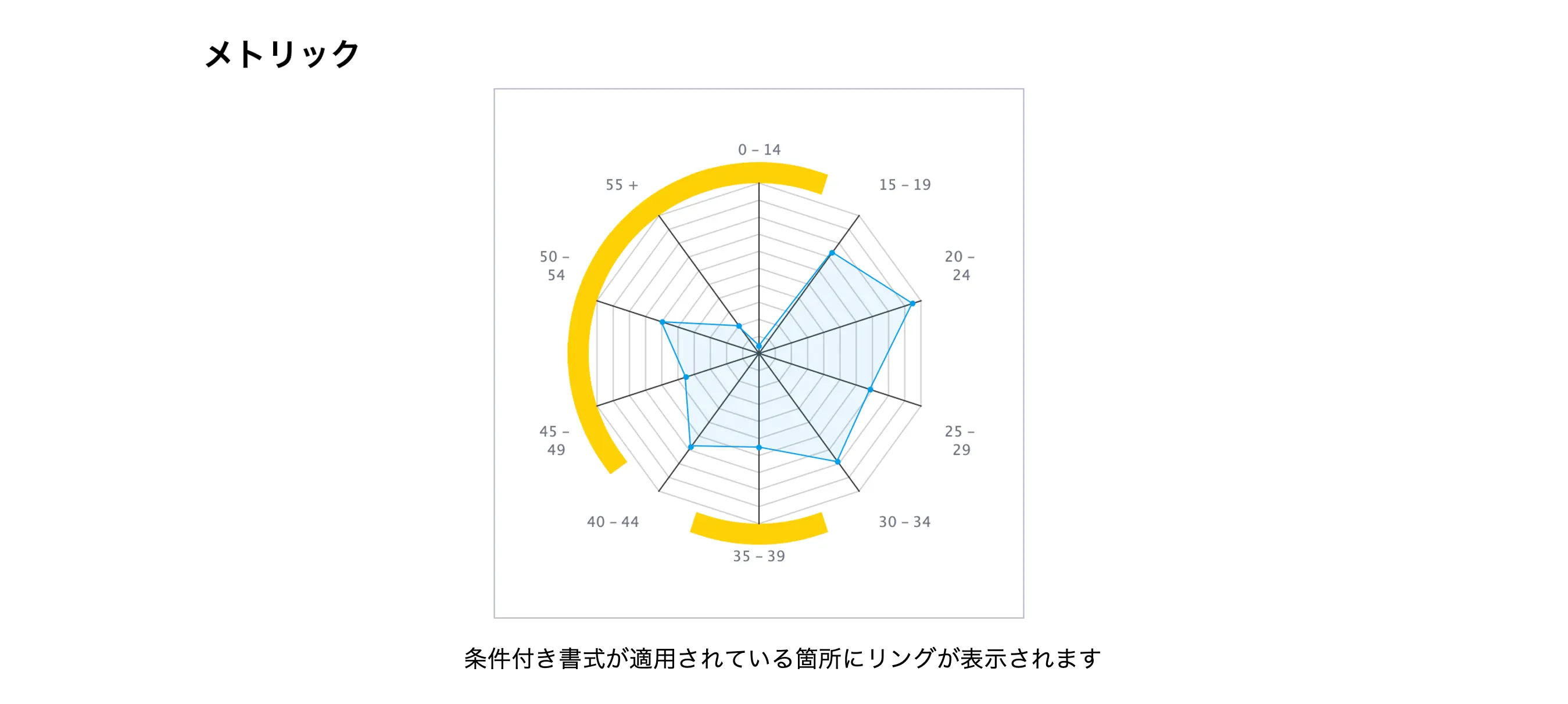 値の大小によってリングの色を変えたい場合はメトリックフィールドに設定された条件付き書式を、特定のグループによってリングの色を変えたい場合はディメンションフィールドに設定された条件付き書式を使用するといったかたちで使い分けができると良いですね。