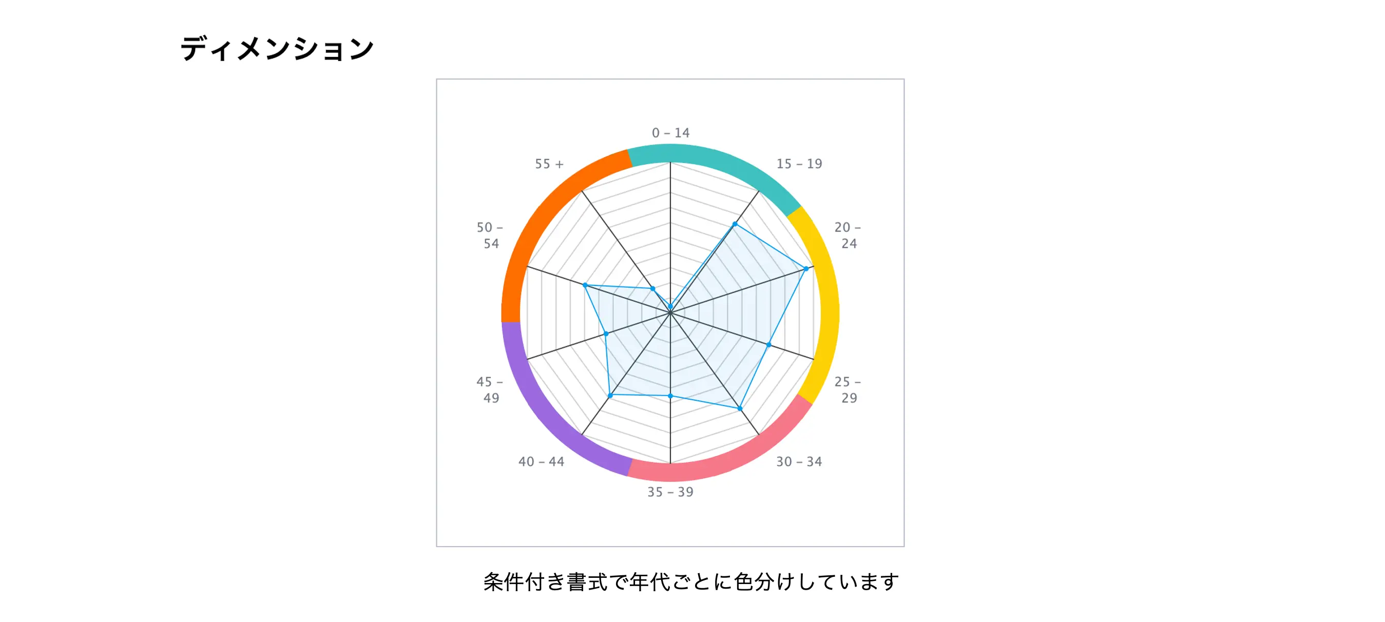 こちらは【Age Group at Camp】に条件付き書式を設定し、『レーダーのグループ化フィールド』に設定した場合の例です。