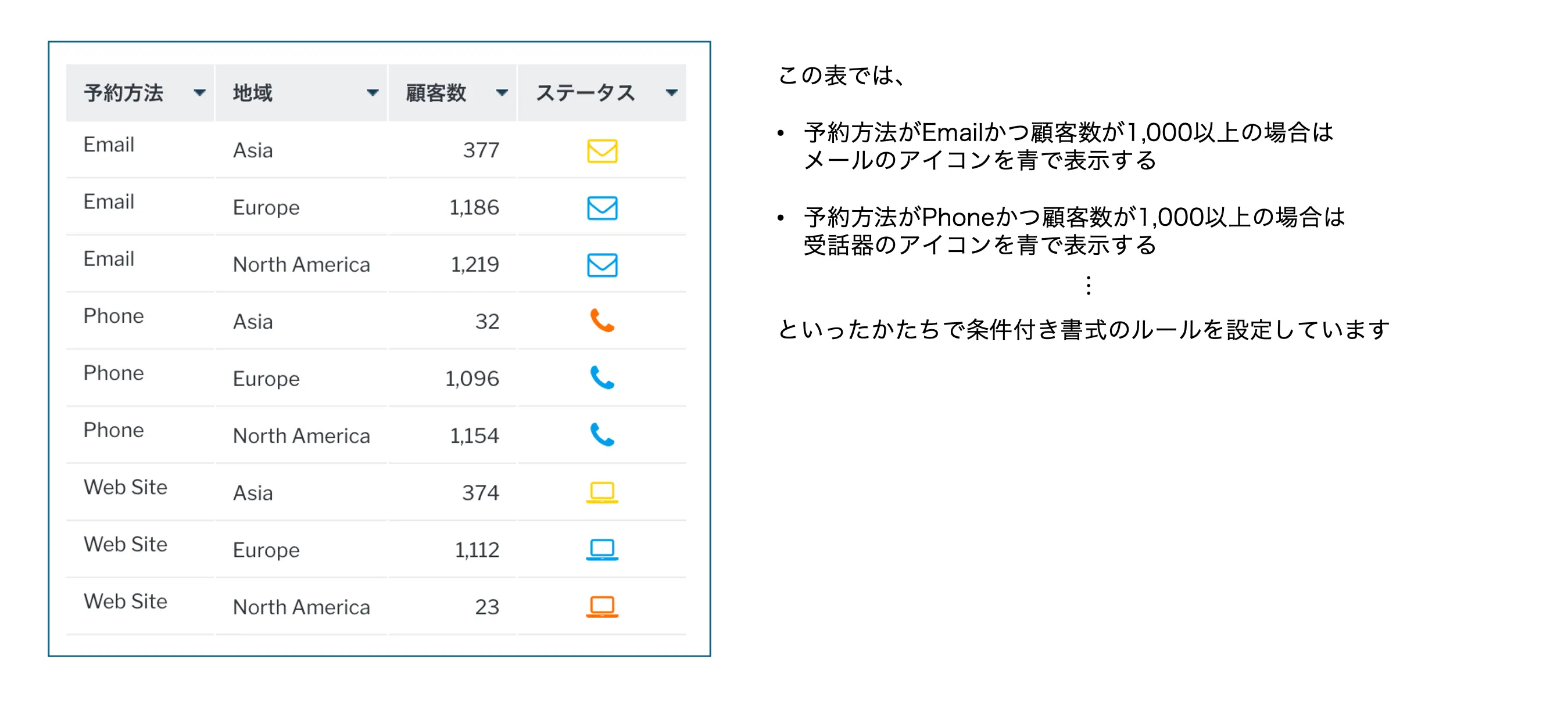 また、条件付き書式のアラートタイプを高度に設定すると、複数の条件を絡めて条件付き書式のルールを指定することができるようになります。例えば、売上の合計が◯◯円以上かつ、利益率が◯◯%以上の商品名のセルを赤くする、といったルールを設定することも可能です。下の図の例では、予約方法によってアイコンの種類を変えて、顧客数に応じてアイコンの色を変えています。