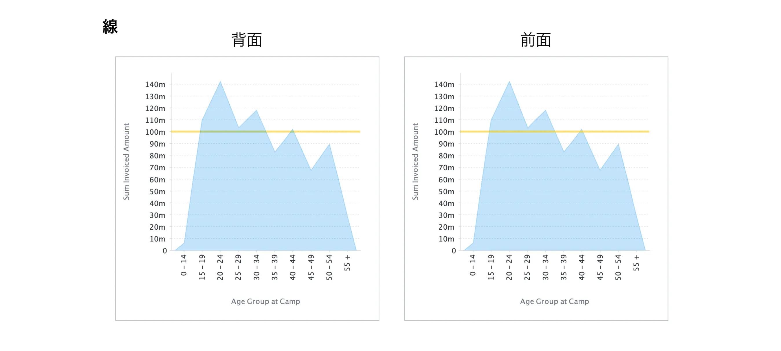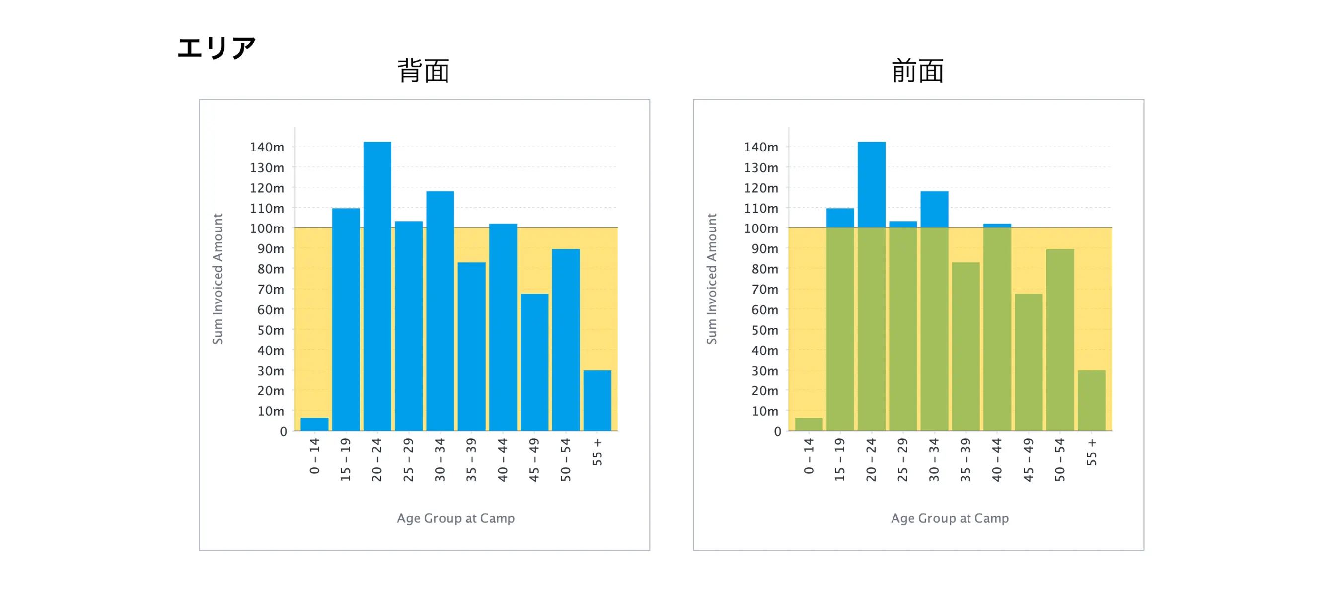 『横軸』に【Age Group at Camp】、『縦軸』に【Sum Invoiced Amount】を設定して縦棒グラフを作成します。縦軸で使用しているメトリックフィールドに条件付き書式が設定されていると、『シリーズの設定』メニューで『条件』という項目が表示されるので、これを有効にして『スタイル』と『位置』を設定します。