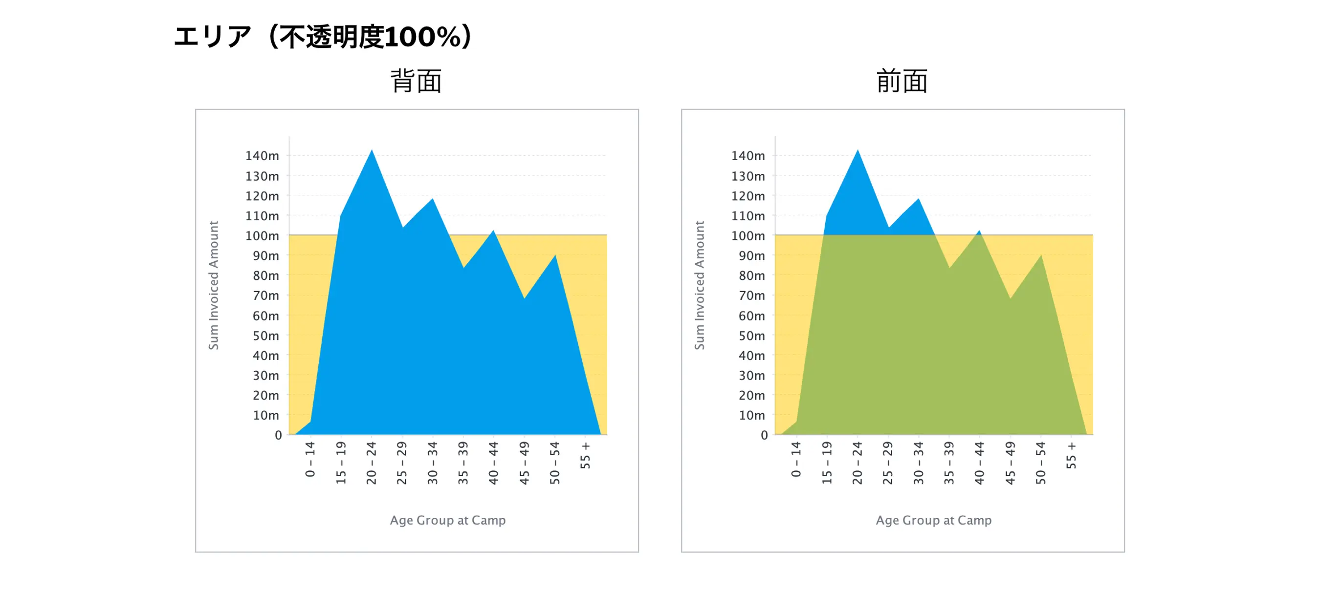 縦棒グラフのようにグラフを透過させないで表示したい場合は、『シリーズの設定』にある『不透明度』を『100%』に設定すればグラフは透過しないようになります。