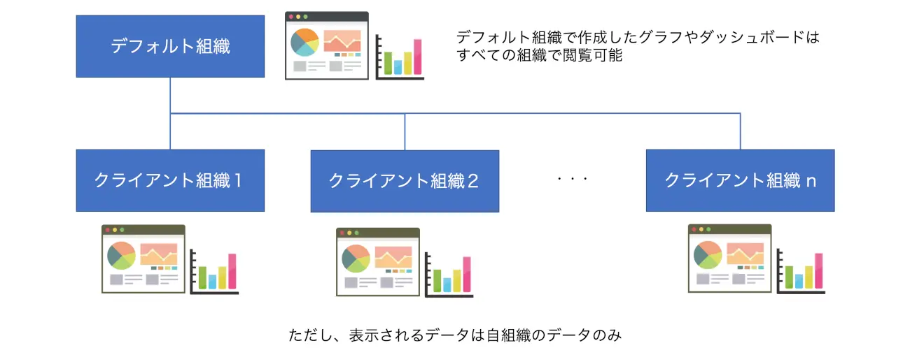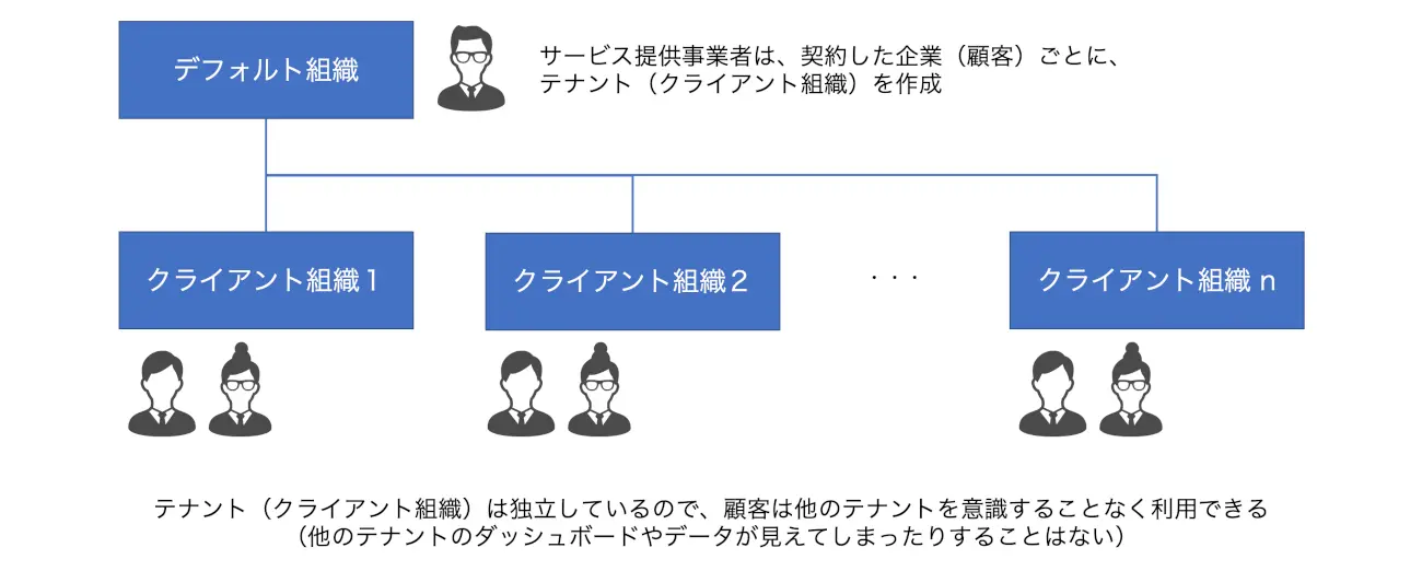 クライアント組織は、親階層であるデフォルト組織、子階層であるクライアント組織の2階層で構成されています。