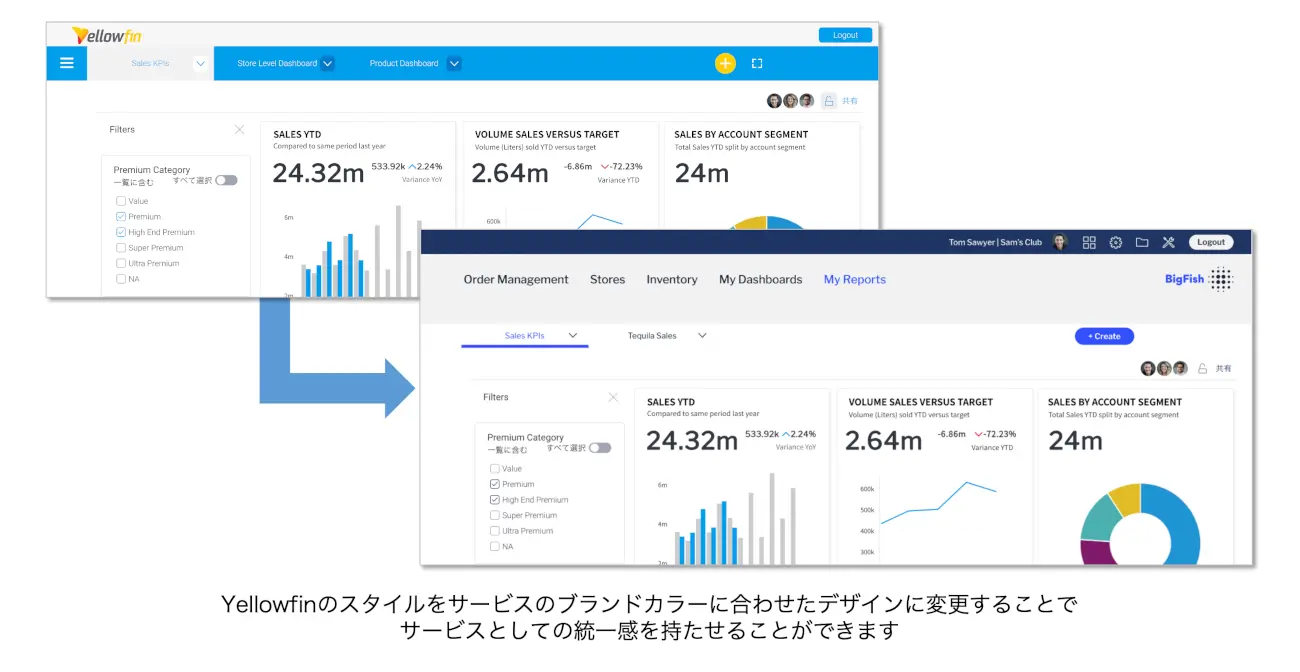 Yellowfinのデザインは、イメージやスタイルシートを使用してカスタマイズすることができるので、組み込み先のサービスのデザインに合うようにカスタマイズをすることによって、サービスに組み込んだ際に統一感を持たせることができます。