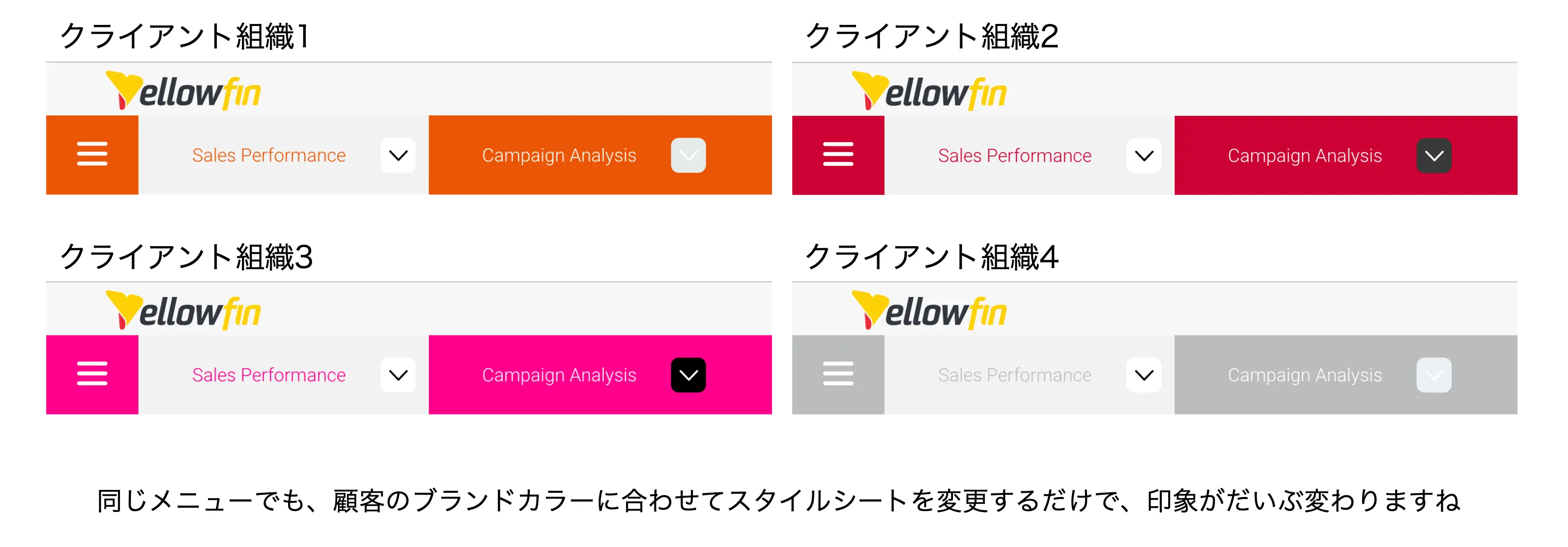 Yellowfinでは、クライアント組織ごとに画面のスタイルやグラフの色などをカスタマイズすることもできるので、顧客ごとにそれぞれのブランドカラーを反映させたデザインを提供する、といったことも可能です。サービス利用者の立場からすると、デザインが自社のブランドイメージに近い色合いにカスタマイズされていると、ちょっとした特別感がありますよね。