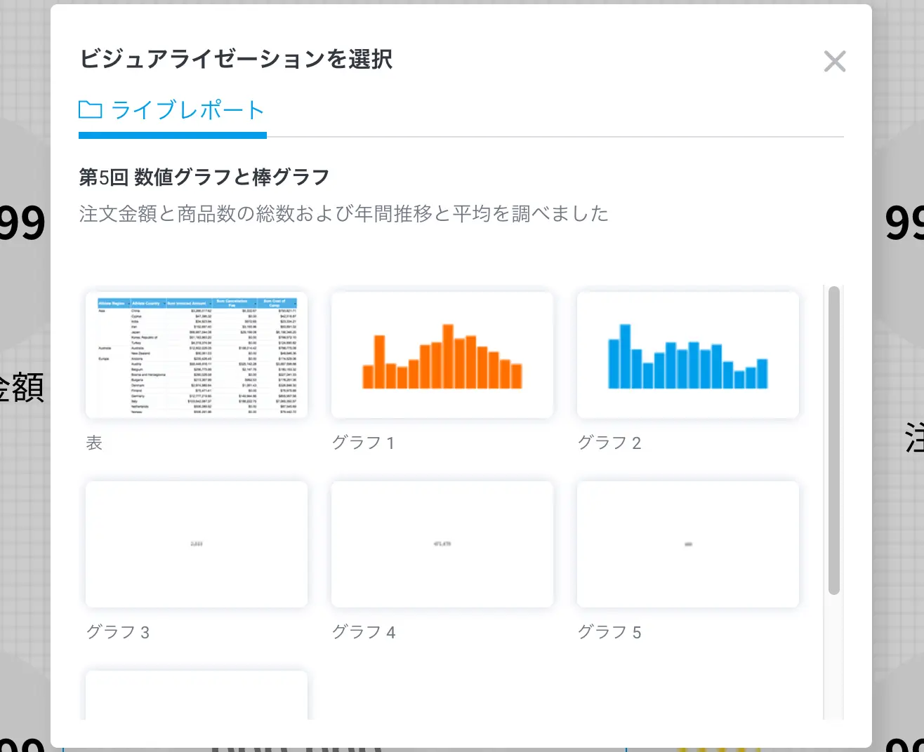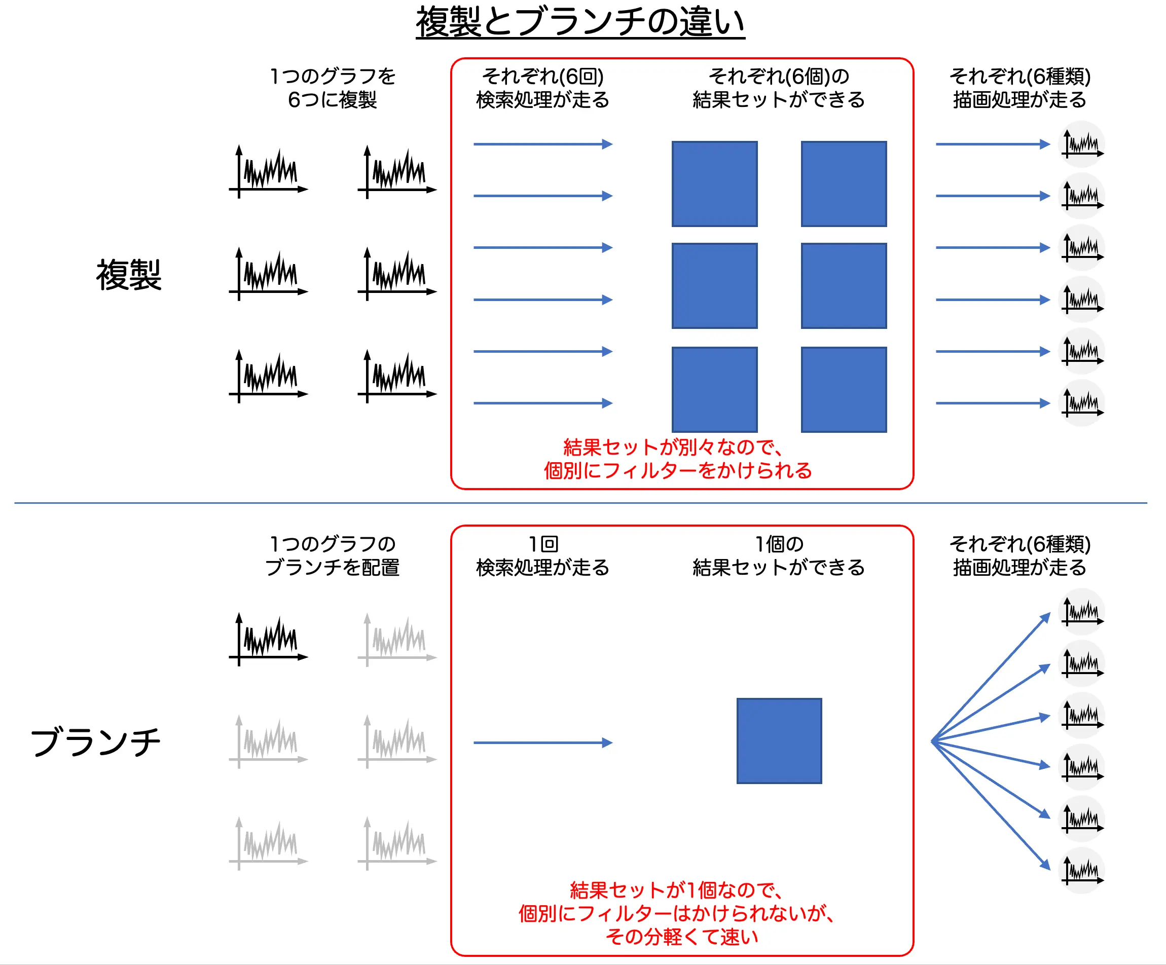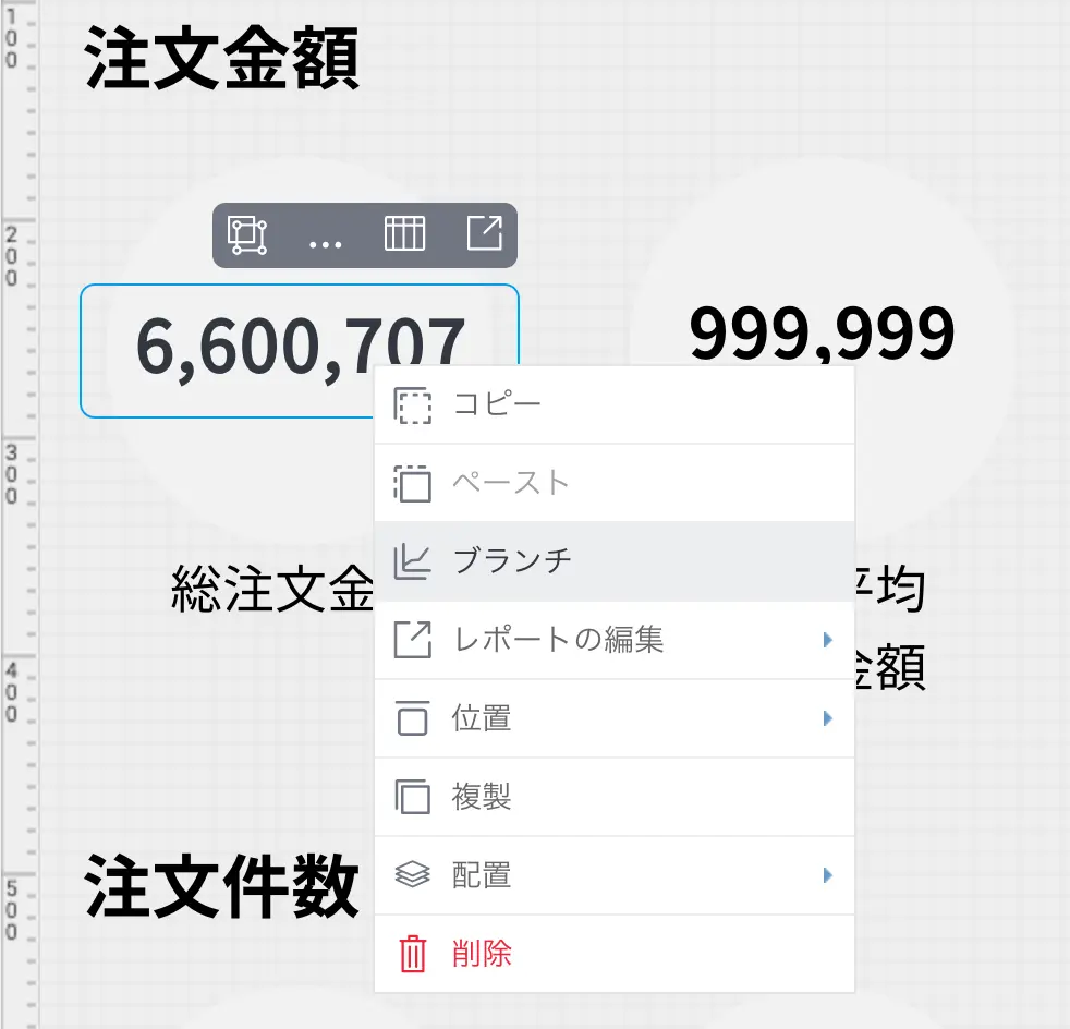 ここで、『複製』と『ブランチ』の違いについて簡単に説明したいと思います。どちらもダッシュボード上のグラフのコピーを複製する機能 (ややこしい) なのですが、『複製』は、レポート (グラフ) 以外のオブジェクトを複製することもできる機能です。『ブランチ』はレポート (グラフ) を複製するときだけ使用できる機能です。図形やテキストなどのオブジェクトで使用することはできません。