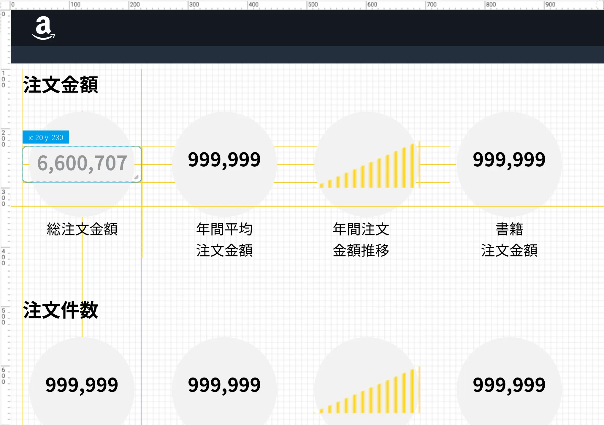 数値グラフのサイズをテキストオブジェクトと同じサイズにして、置き換えます。数値グラフをドラッグすると、上下左右のグラフとの位置が揃えやすいようにガイド (黄色い線) が表示されます。今回作成するダッシュボードでは、他のグラフと位置を揃えて配置してあるので、ガイドに合わせて配置することで、オブジェクトの置き換えもスムーズにできます。