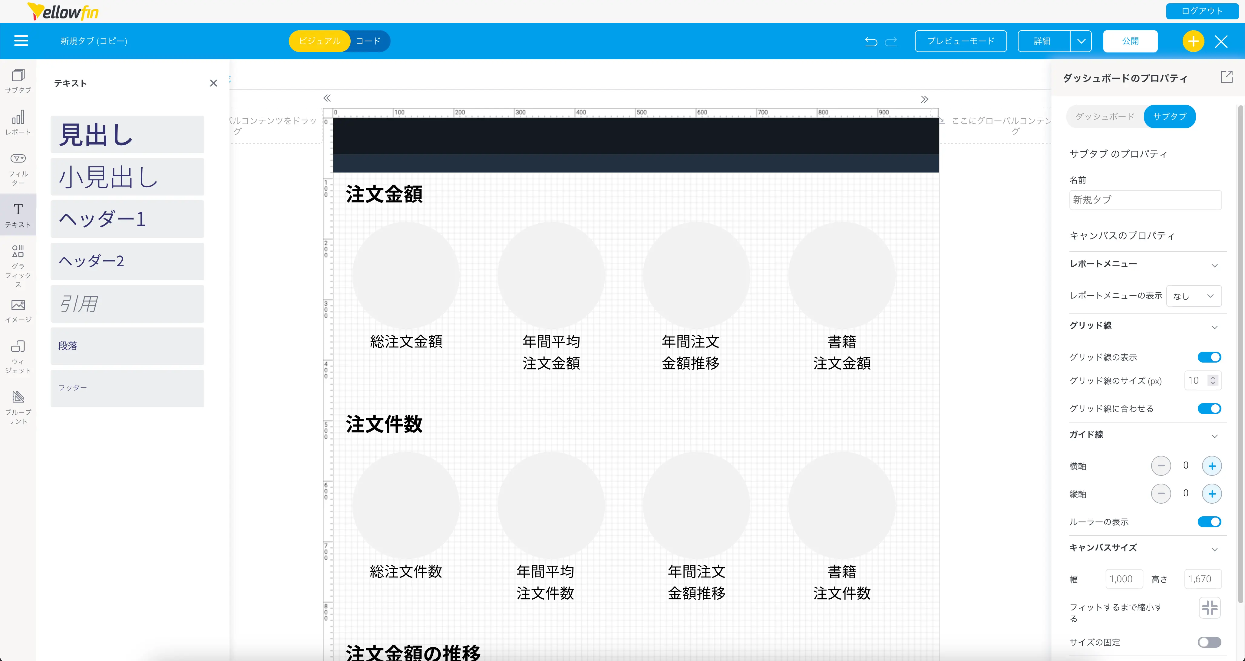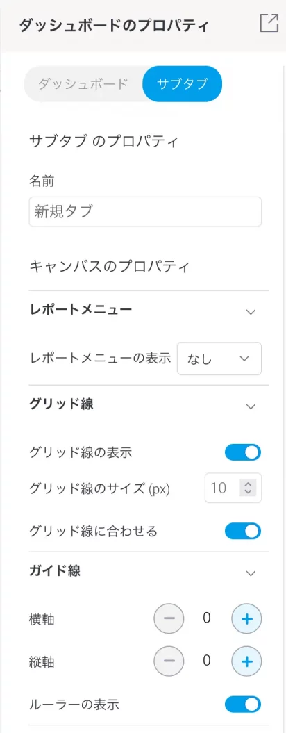 キャンバスレイアウトのダッシュボードを作成する場合、キャンバスにグリッド線やルーラーを表示しておくと、コンテンツの位置を揃えるときに便利です。最初にダッシュボードのプロパティで、これらを表示するように設定しましょう。『グリッド線に合わせる』の設定を有効にすることで、グラフの位置が合わせやすくなります。