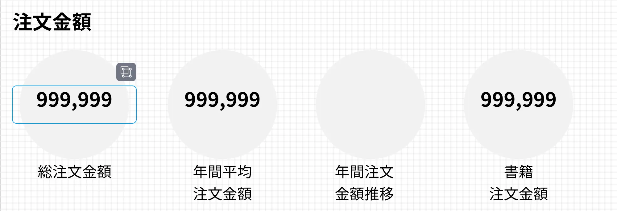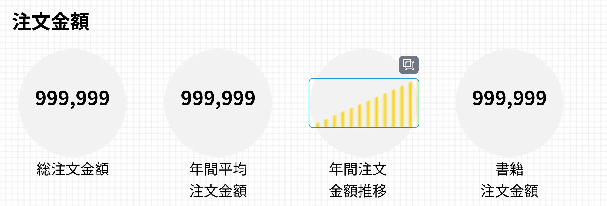 ヘッダーや背景、ダッシュボードに表示するテキストが配置できたら、グラフの仮置きをしてみましょう。数値グラフは、何桁の数値をどれくらいの大きさで表示すれば良いかを確認できれば良いので、実際に数値を入力したテキストを配置してみると良いです。