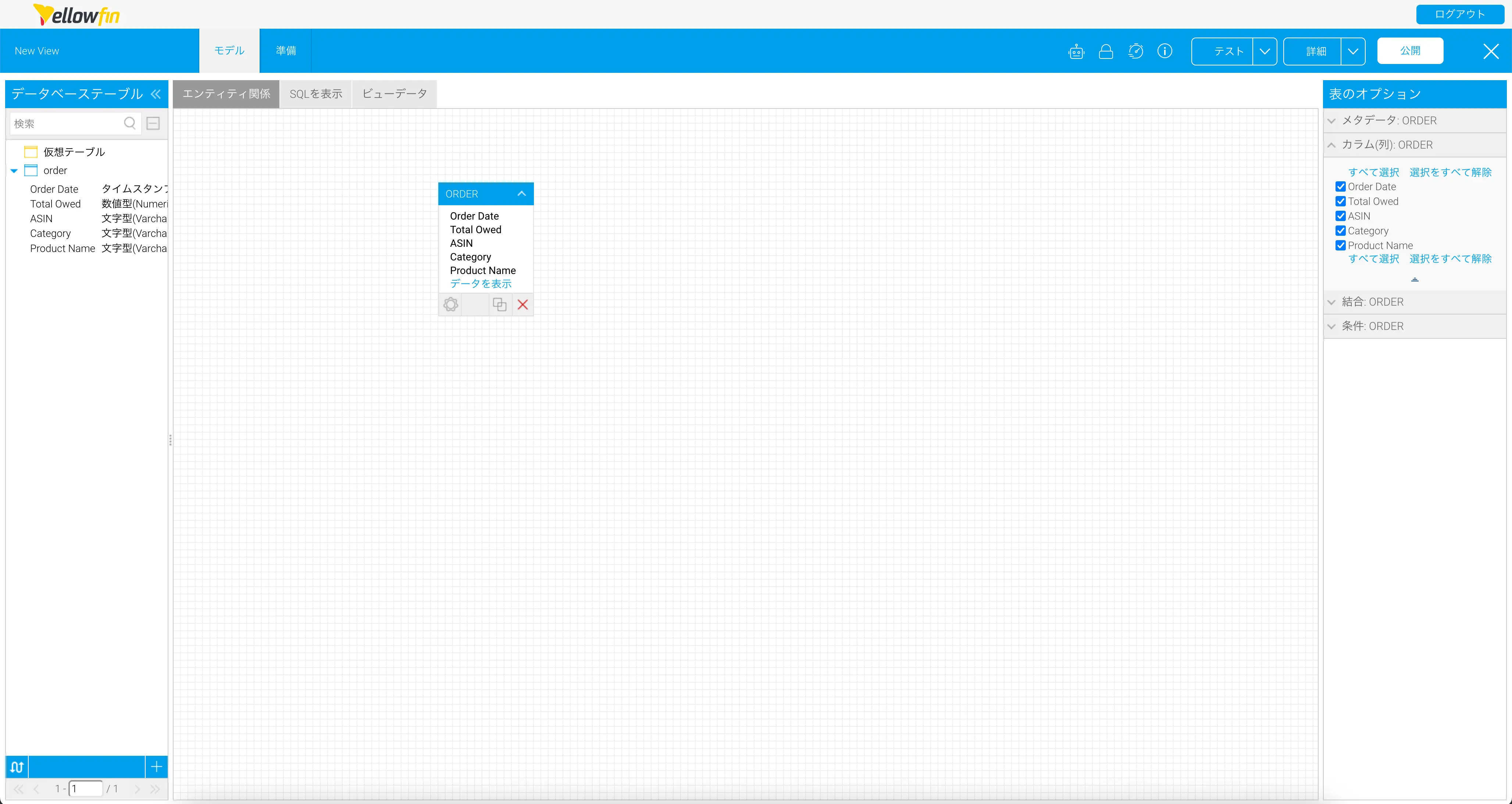 モデル画面では通常、売上実績などのトランザクションテーブルと商品マスタのようなマスタテーブルを結合するのですが、前述のとおり、今回はorderテーブル一つしか使用しないので、キャンバスにテーブルを追加してすべてのカラムを選択したら、準備画面に進みます。