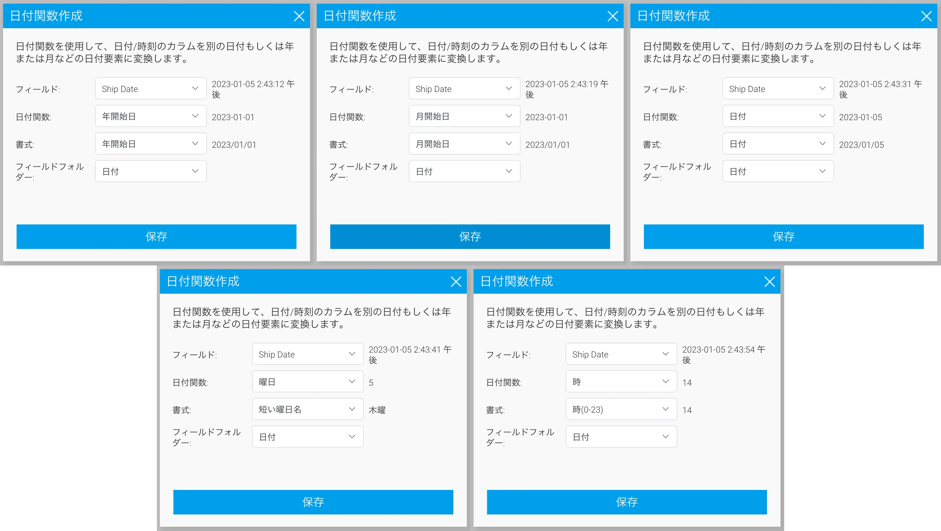 【Order Date】に対して、『年開始日』『月開始日』『日付』『曜日』『時』の『日付関数』を作成します。