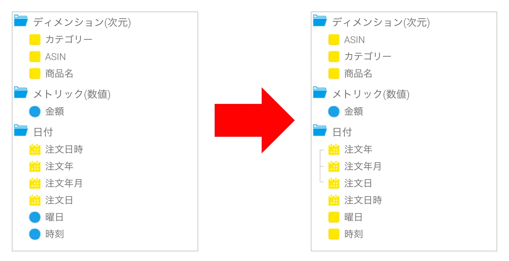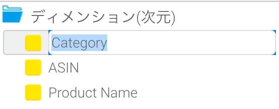 フィールドの並び順を変更してフィールドを整理しましょう。レポートを作成する場面を想像しながら並べかえると良いと思います。使いたいフィールドを見つけやすい並び順を考えてみてください。例えば、頻繁に使用しそうなフィールドをフォルダーの上の方に並べるとか、関連するフィールドは近くに並べるとか。フィールドの数が多い場合は、フィールドフォルダーを追加して整理するという手段もあります。