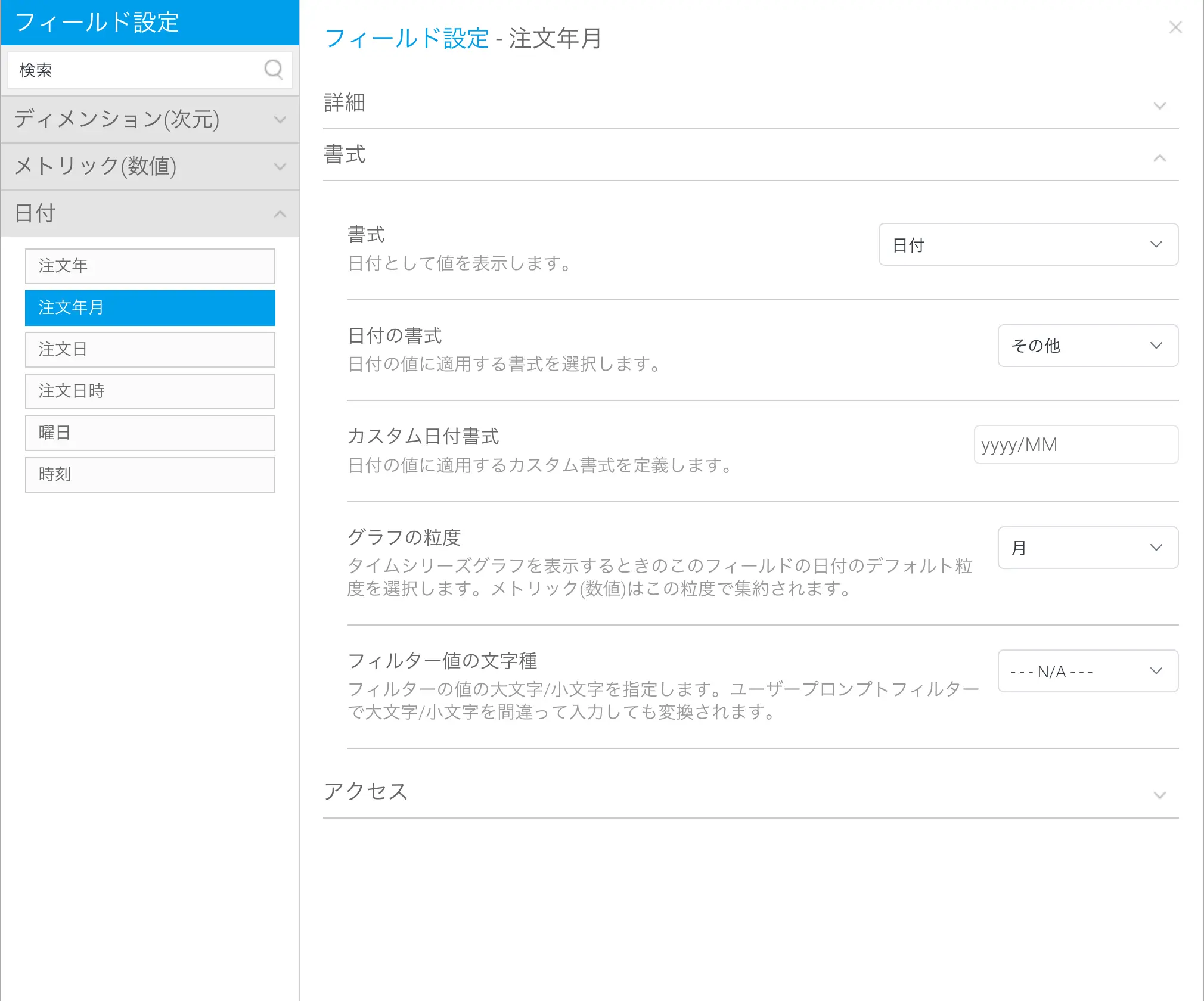 ほかの日付のフィールドの書式も変更していきます。【注文年】【注文年月】のフィールドは『日付の書式』を『その他』に設定して、『カスタム日付書式』を設定します。【注文年】はyyyy、【注文年月】はyyyy/MMに設定します。【注文日】のフィールドは『日付の書式』を『yyyy/MM/dd』に設定します。日付の書式を設定するついでに『グラフの粒度』も設定しておくと良いです。【注文日時】は『時間の書式』を『H:mm:ss』に設定します。『グラフの粒度』は『秒』です。