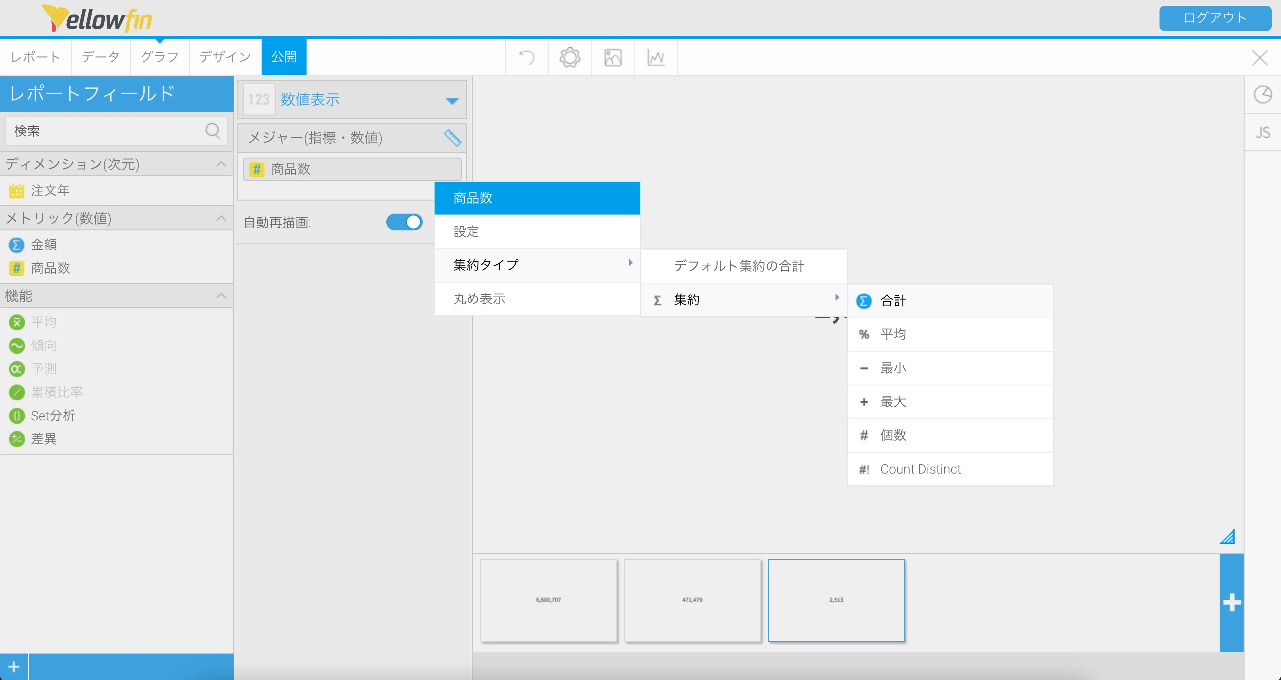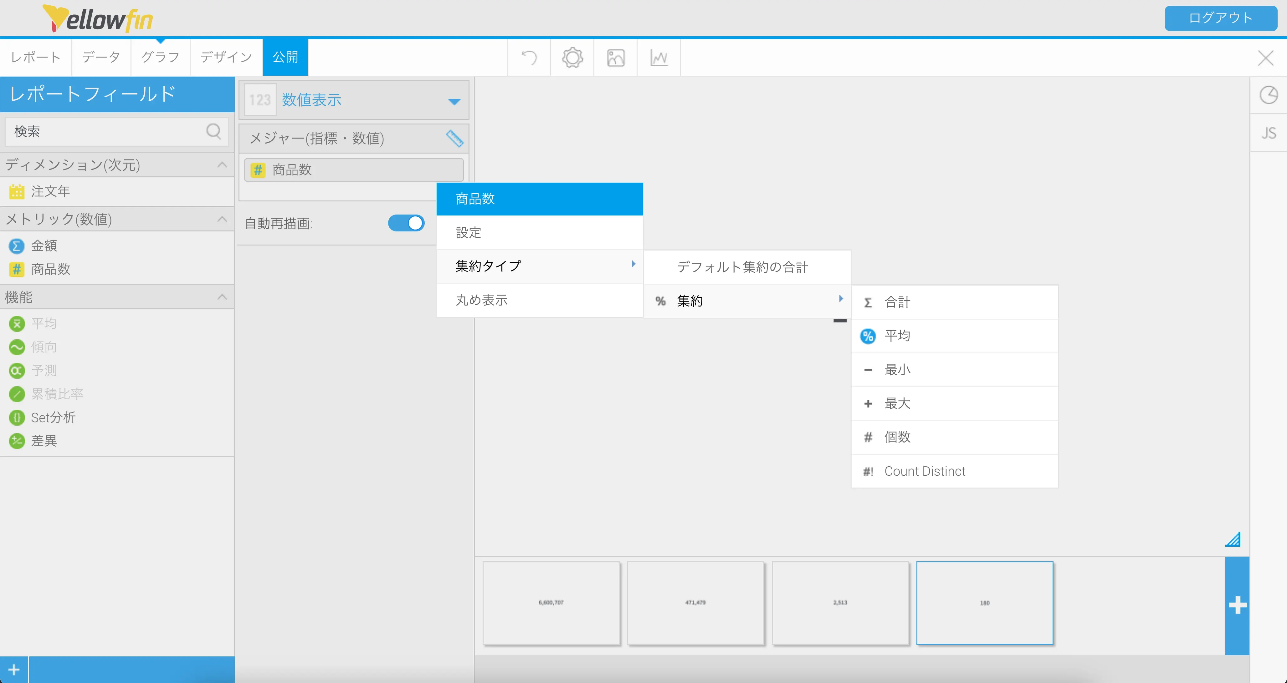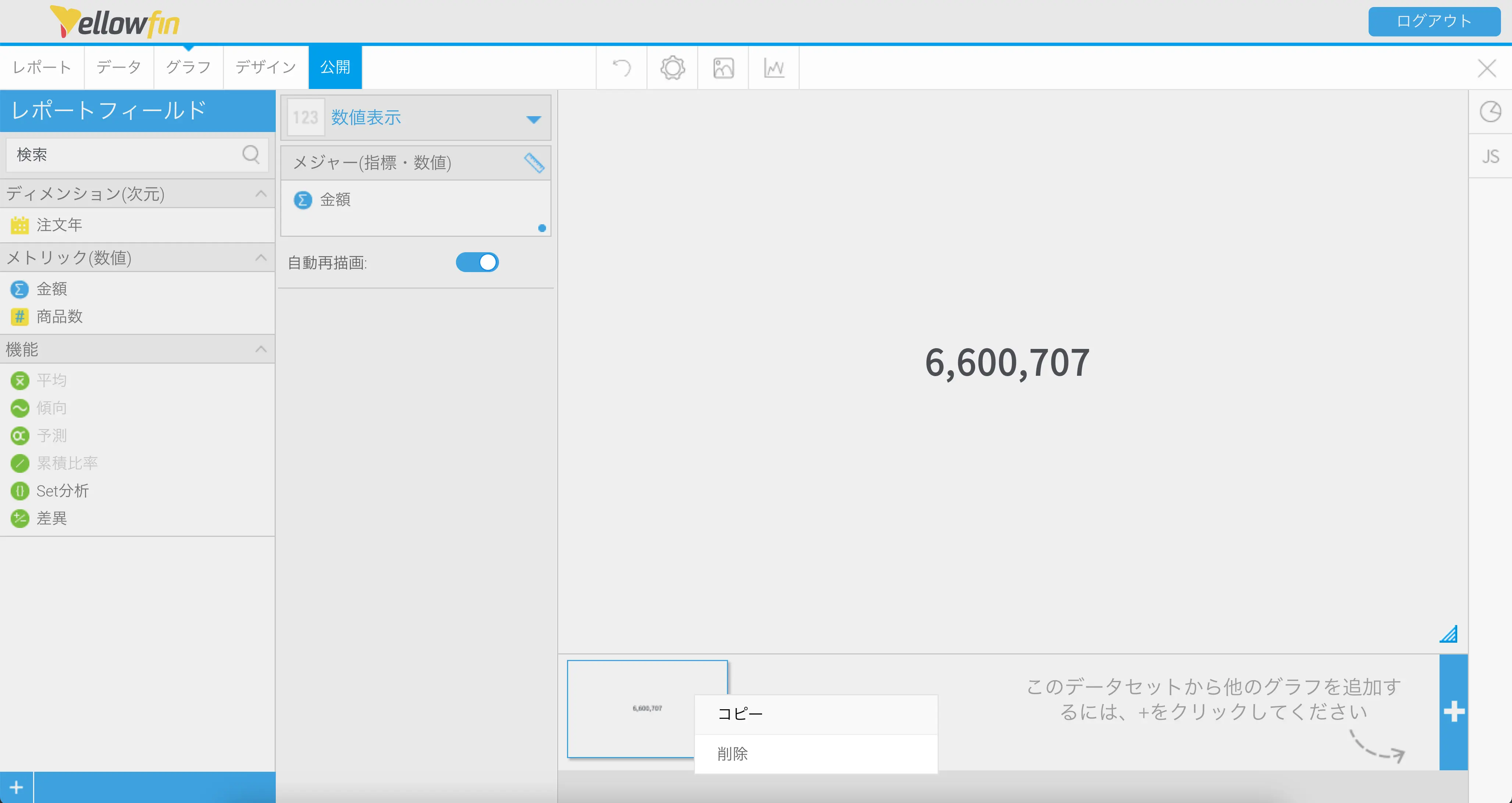 さらにグラフをコピーして注文商品数の総合計を表示する数値表示グラフを作成します。メジャー (指標・数値)のフィールドを、金額から商品数に置き換えて、集約タイプ合計に設定すればできあがりです。