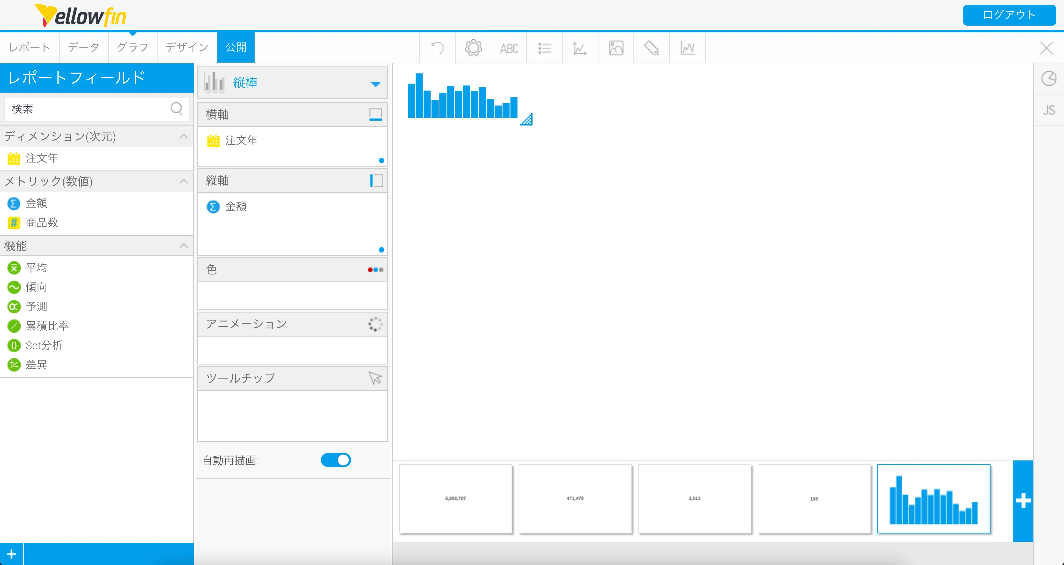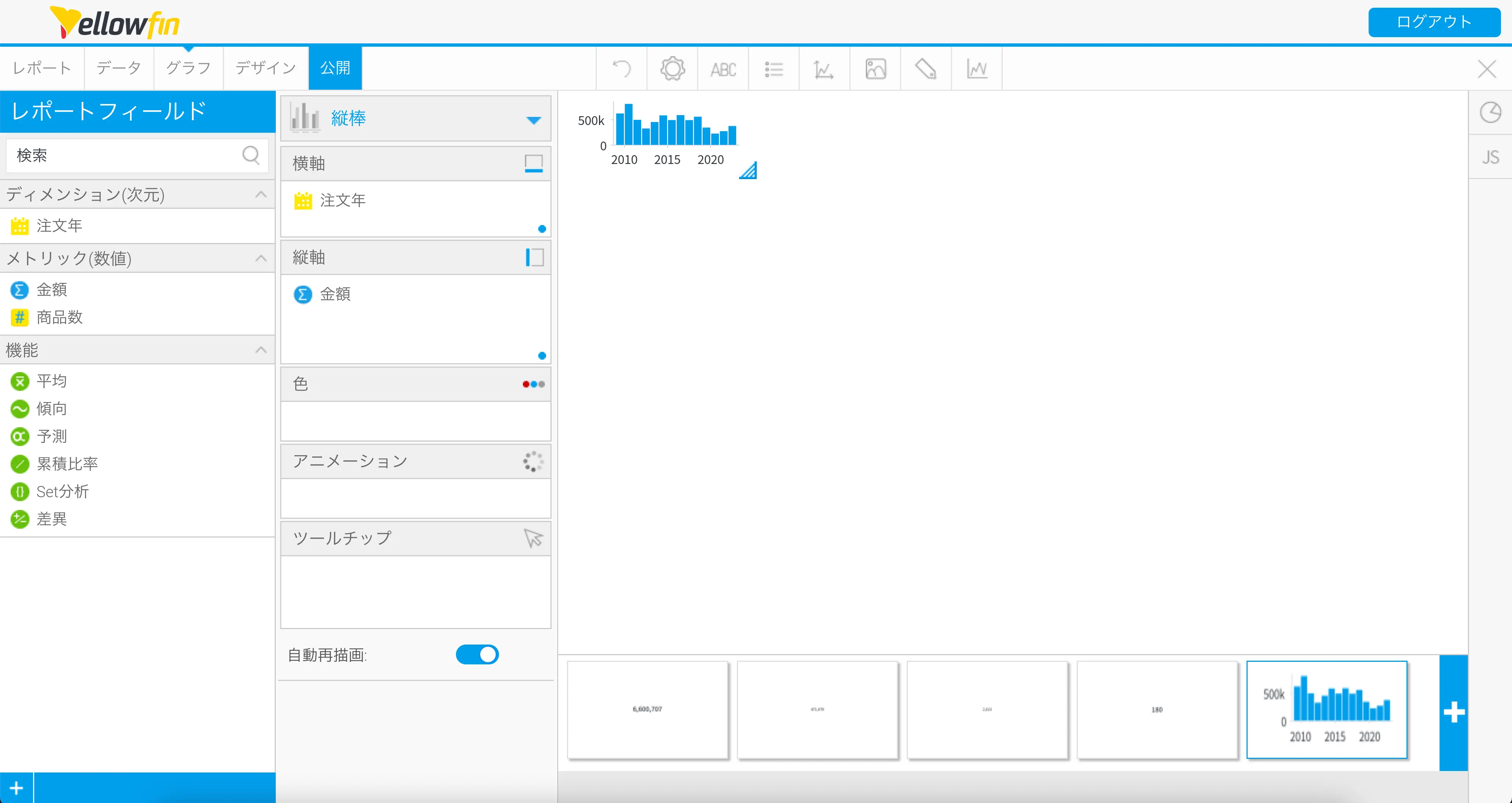 以上で、1つのレポートから6つのグラフを作成することができました。公開ボタンをクリックしてレポートを保存してください。