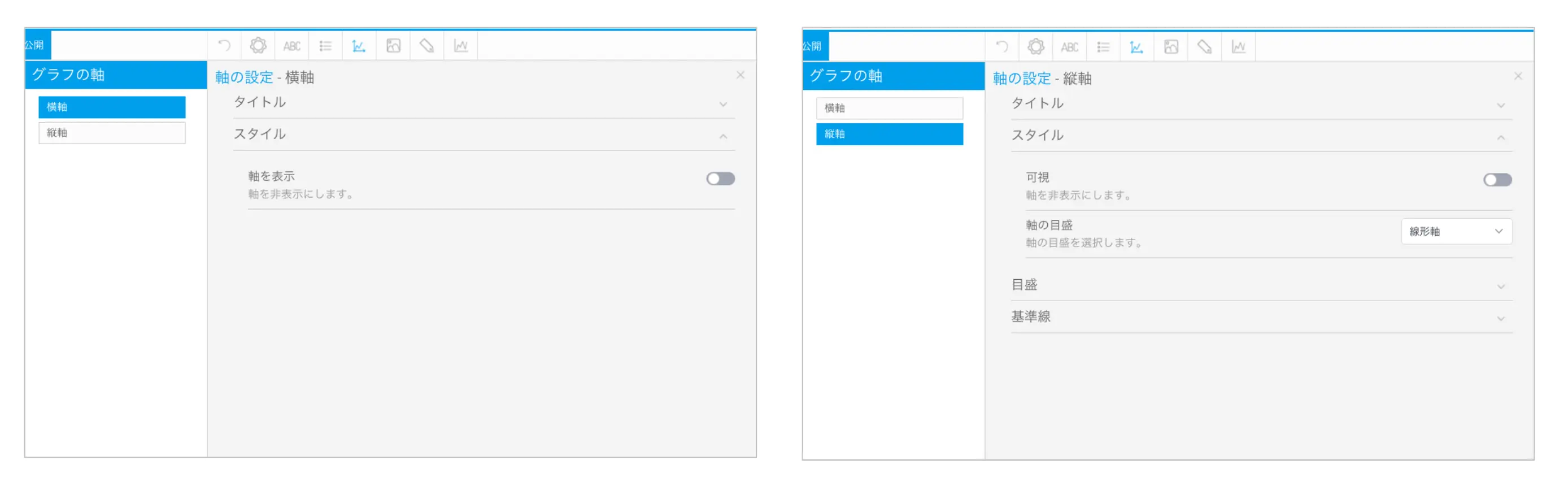 横軸スタイル軸を表示縦軸スタイル可視をそれぞれ無効に設定します。