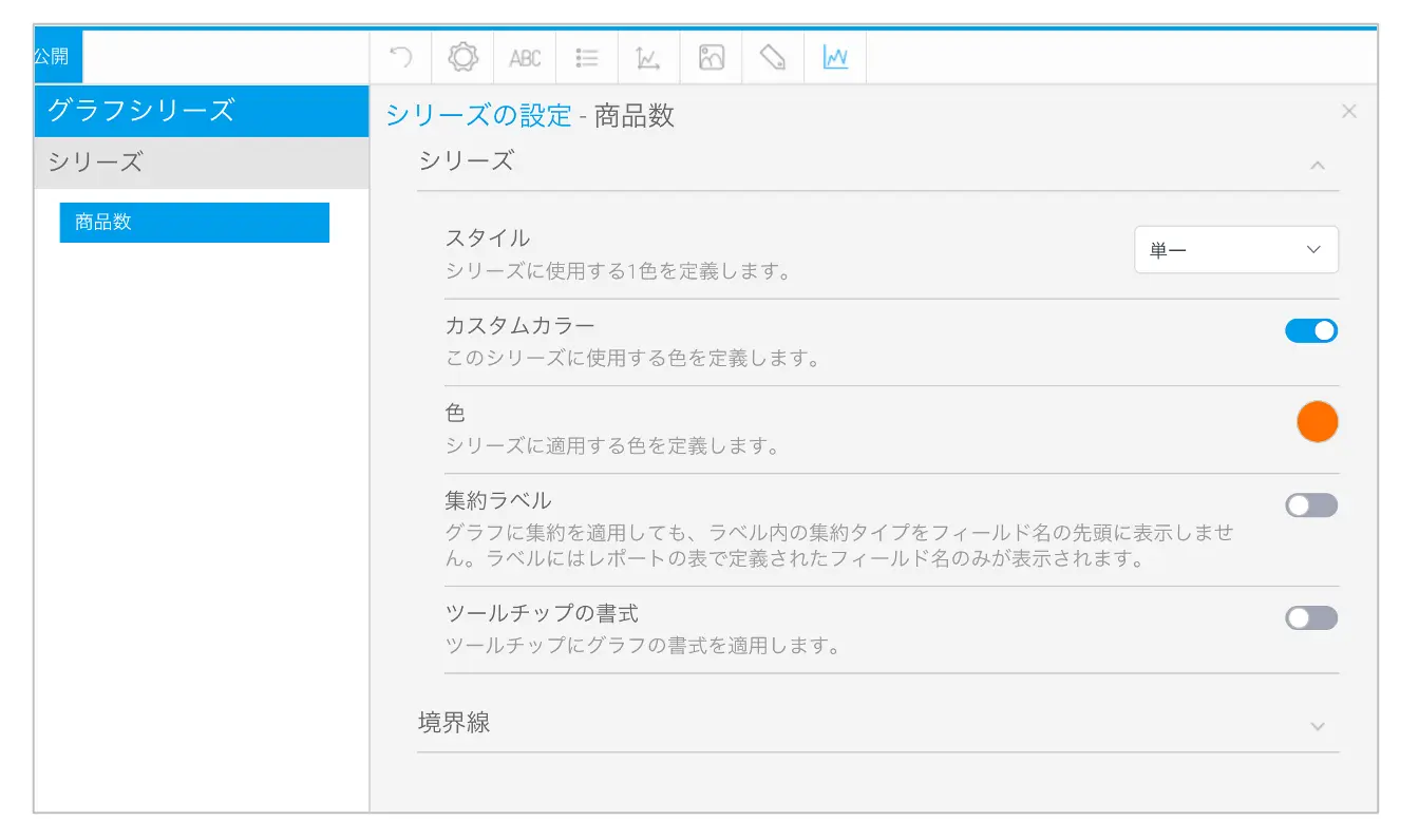 これで、注文金額の年間推移を表示する縦棒グラフが完成しました。このグラフをコピーして、注文商品数の年間推移を表示する縦棒グラフを作成します。縦軸のフィールドを、金額から商品数に置き換えればできあがりなのですが、注文金額のグラフと見分けやすいように、注文商品数のグラフの色を変えてしまいます。シリーズの設定商品数を選択し、を指定します。