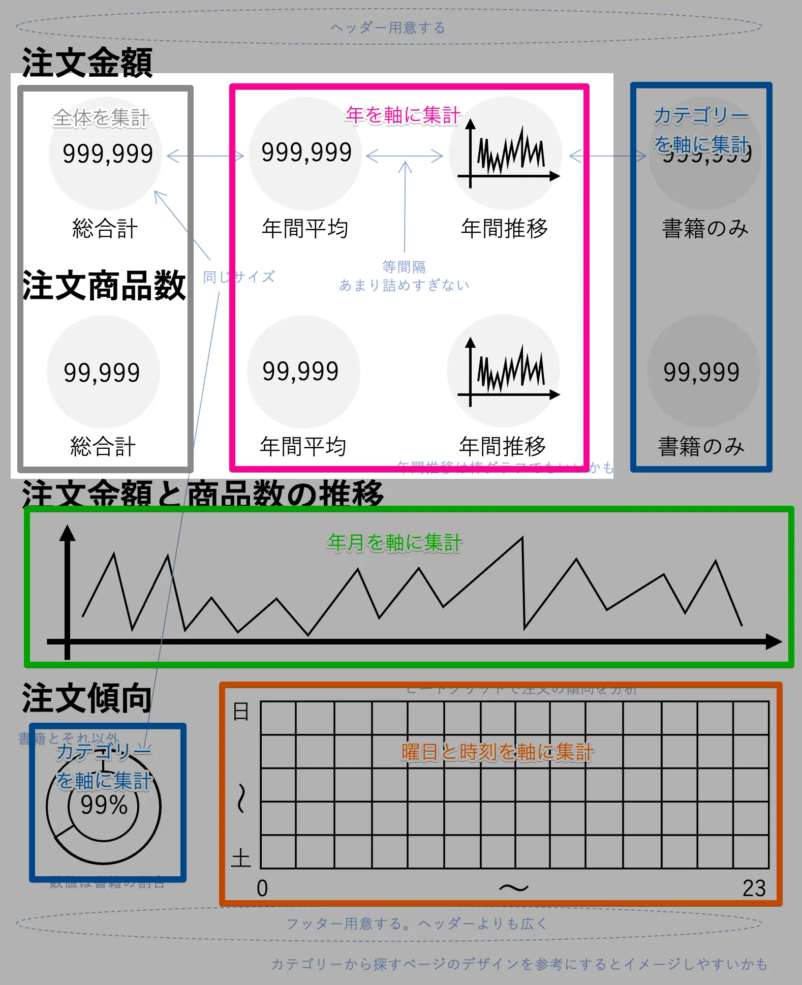 グラフは表の数値を元に再集計して描画する仕組みになっているので、グラフを集計軸ごとに仕分けることによって、作成すべき表 (レポート) を洗い出すことができます。基本的に集計軸が同じグラフは、1つのレポートから作成することができると考えていただいて構いません。集計軸別に分類してみると、下記の5つに分類することができると思います。