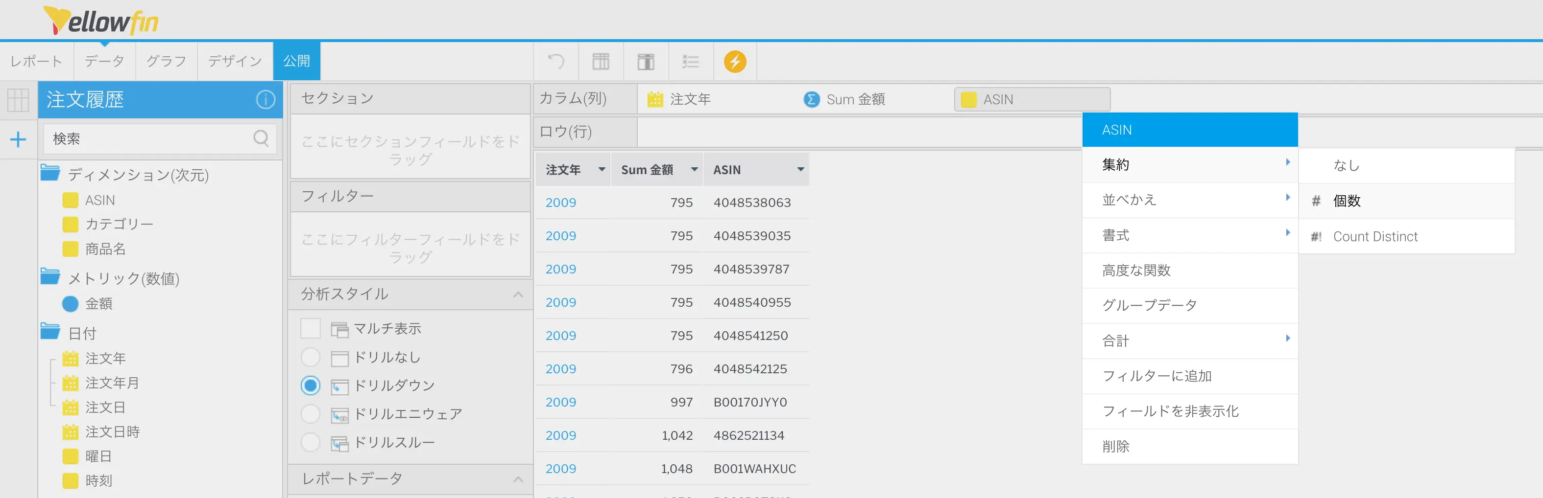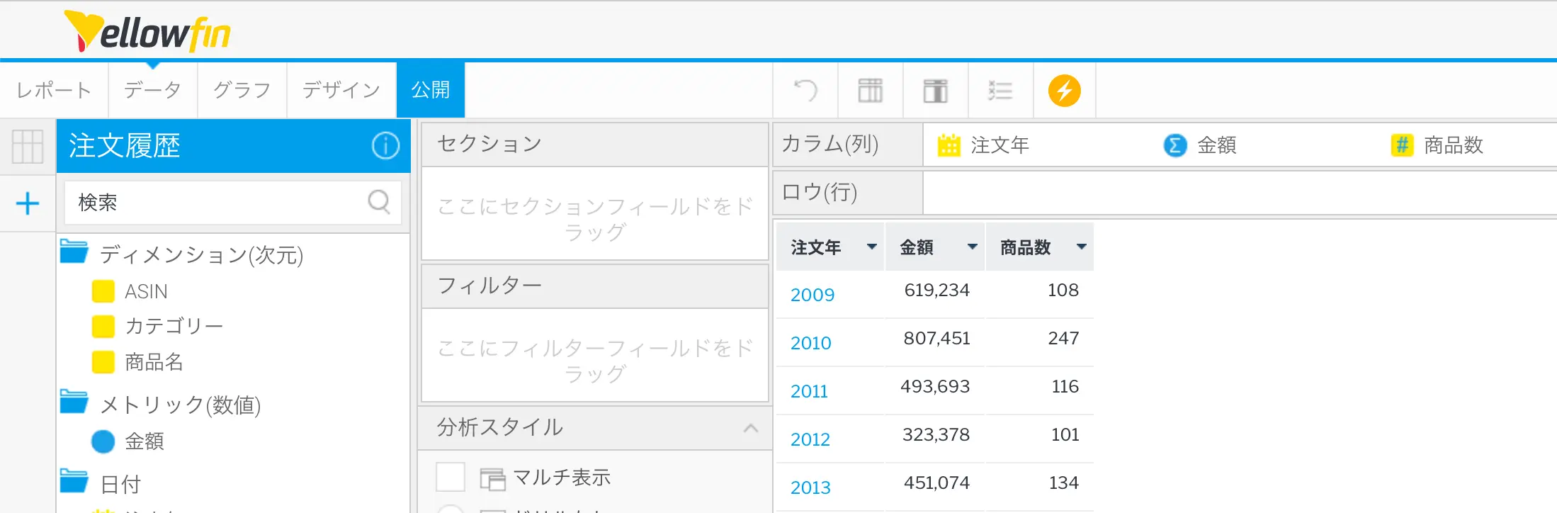 前回作成した注文履歴のビューを選択してレポートを作成します。年間平均や年間推移をグラフで表現するために、注文年を軸に注文金額注文商品数を集計する表を作成します。使用するフィールドは、【注文年】【金額】【ASIN】です。それぞれをカラム (列) 欄に追加してください。金額合計で集約します。【ASIN】個数で集約することで注文商品数を求めることができます。